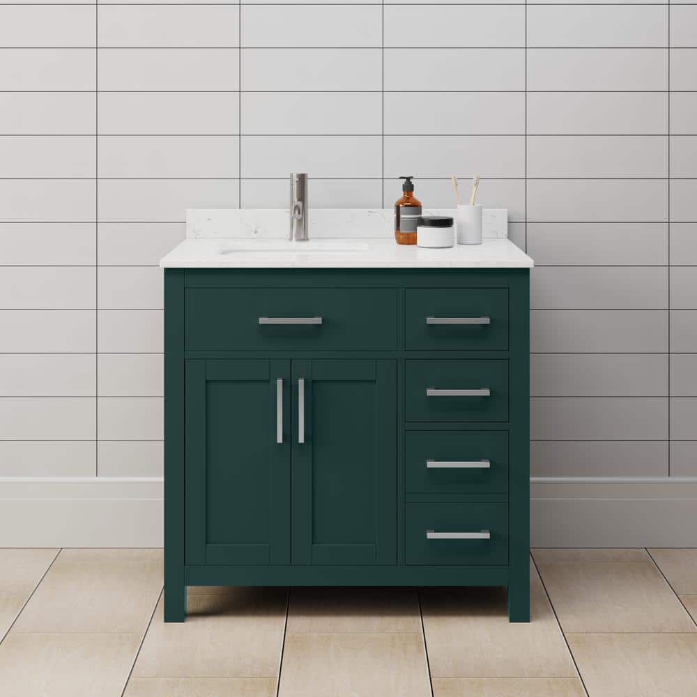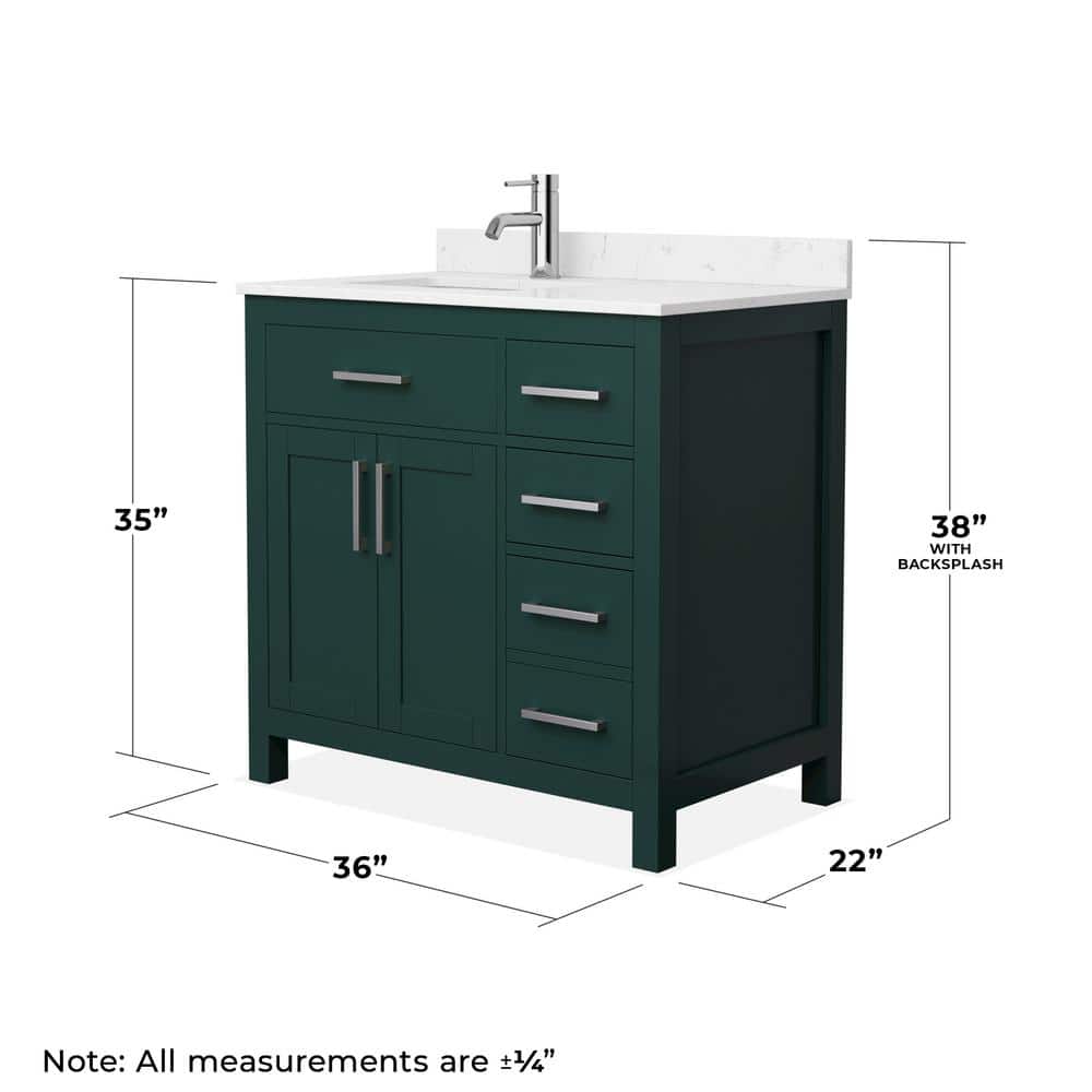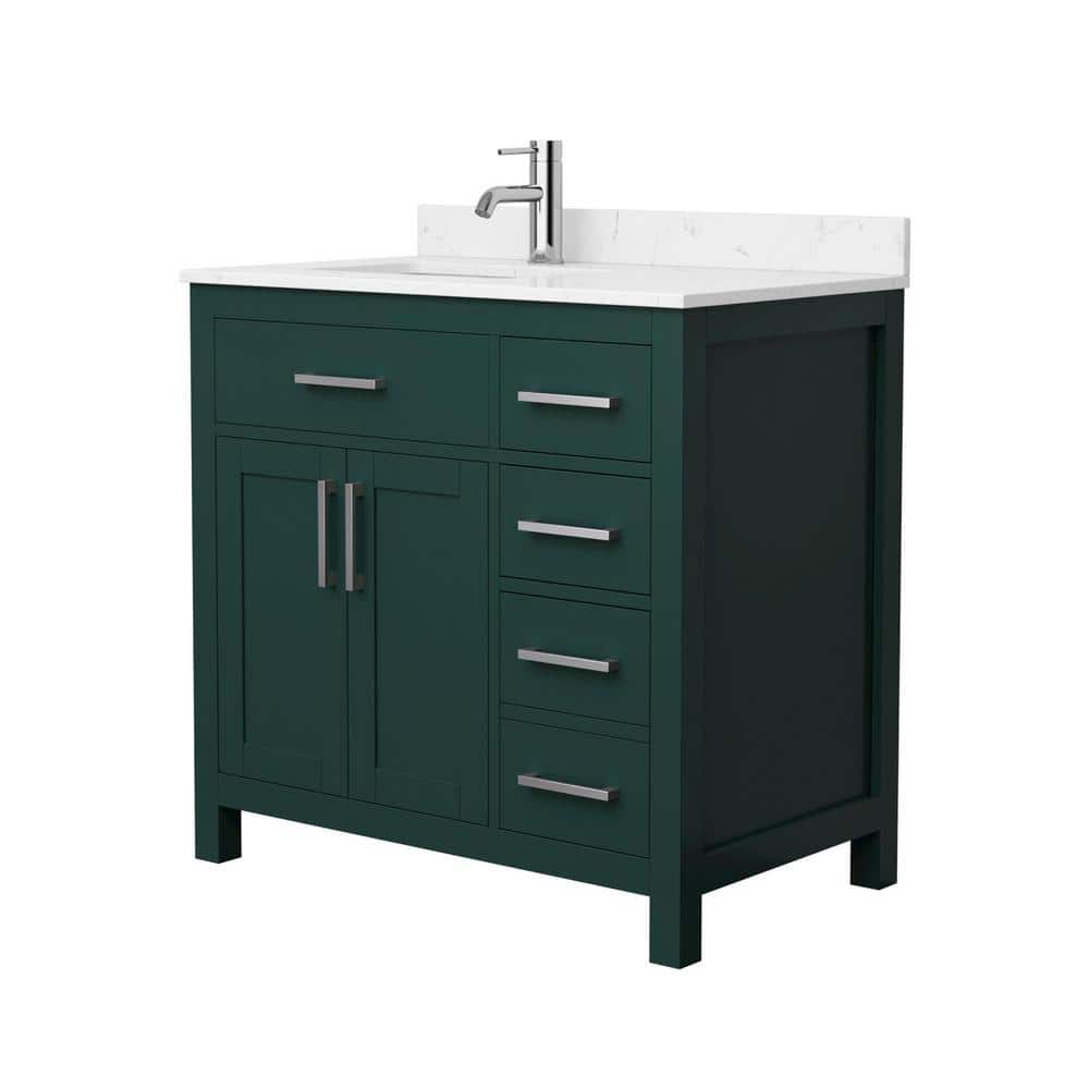 The Wyndham Collection Beckett 36" Bathroom Vanity combines timeless design with modern functionality. Featuring a green wood cabinet, Carrara cultured marble top, and soft-close doors, it offers ample storage and a luxurious finish.