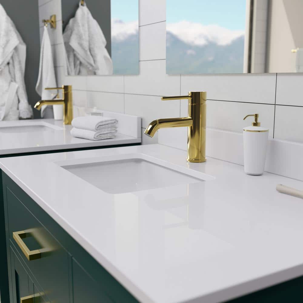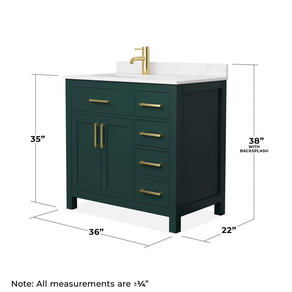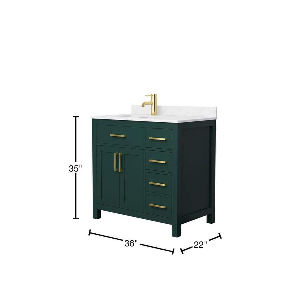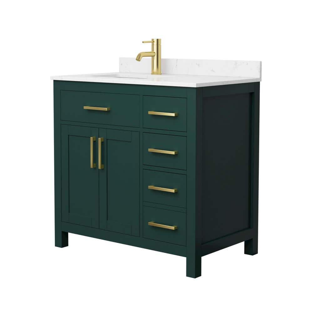 The Wyndham Collection Beckett Bathroom Vanity combines timeless design with modern functionality. Featuring a green wood cabinet with brushed gold trim and a Carrara cultured marble top, it offers ample storage and a luxurious aesthetic.