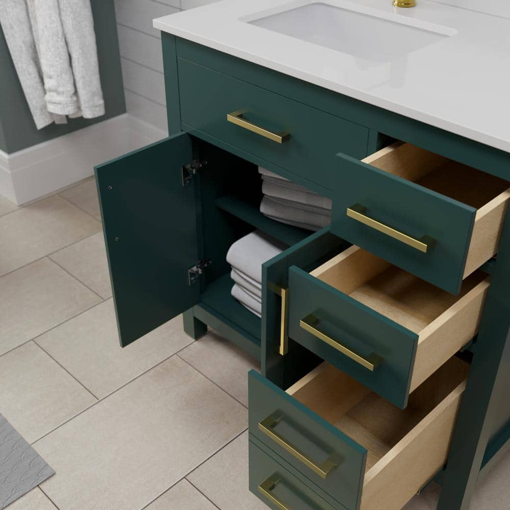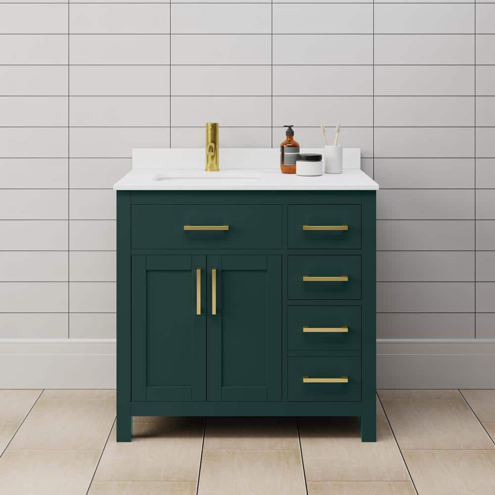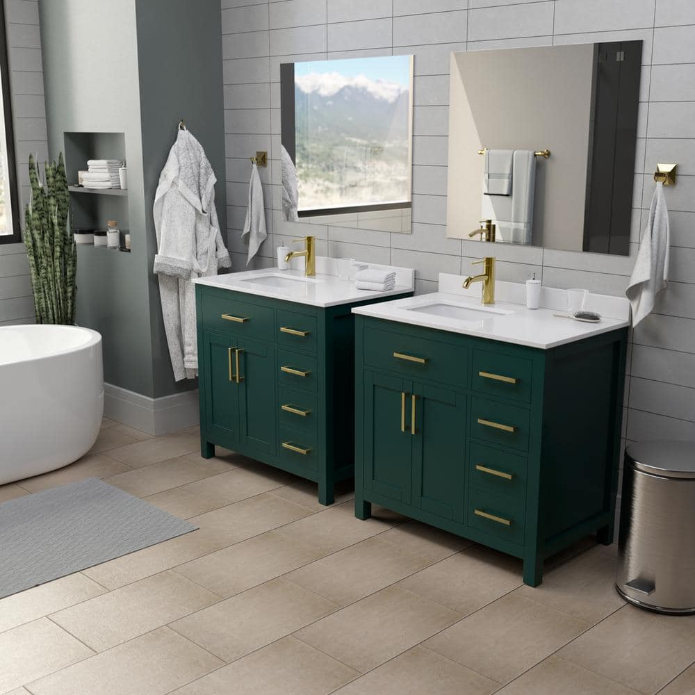 The Wyndham Collection Beckett 36" Bathroom Vanity combines timeless design with modern functionality. Featuring a green finish with brushed gold trim, it includes a white cultured marble top and ample storage space.