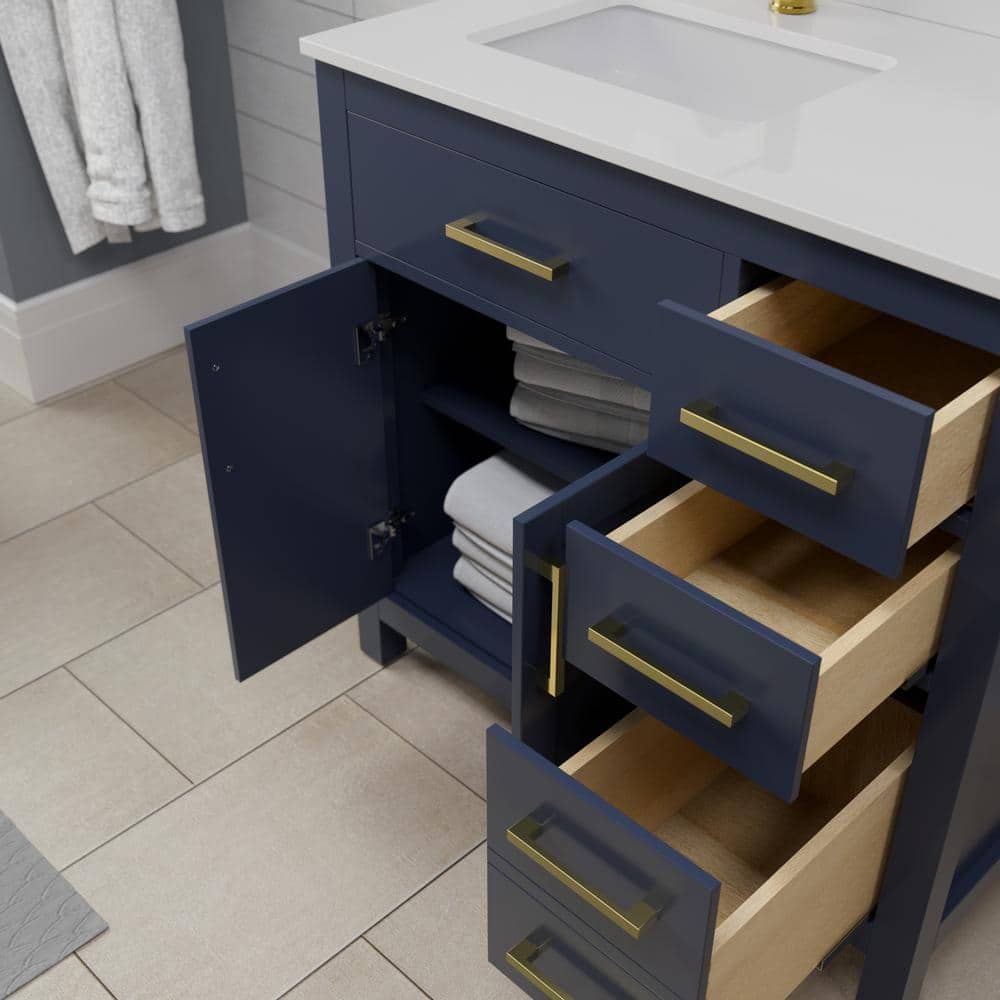 Elegant Design: Dark blue cabinet with brushed gold trim and white cultured marble top.