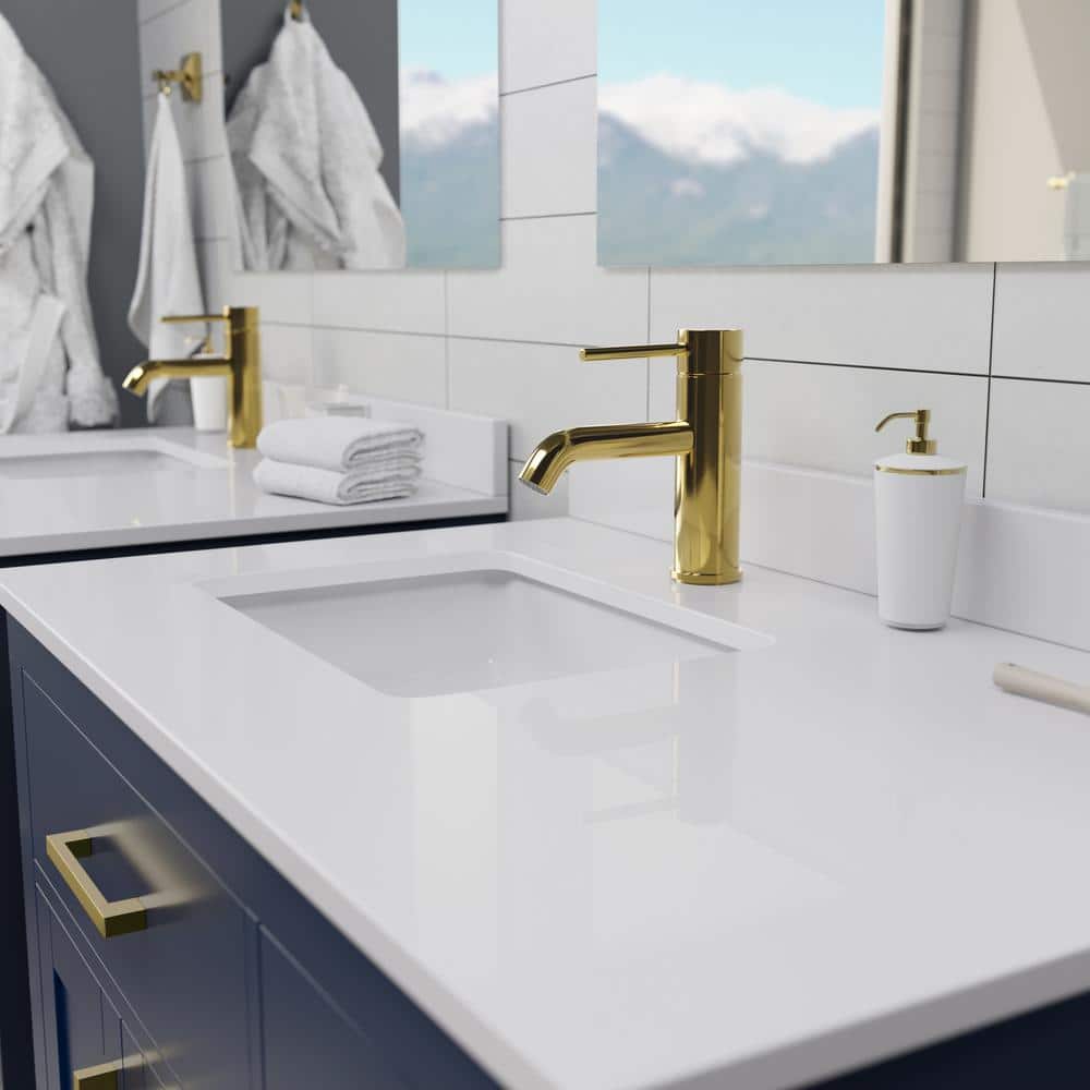 Elegant Design: Dark blue cabinet with brushed gold trim and white cultured marble top.