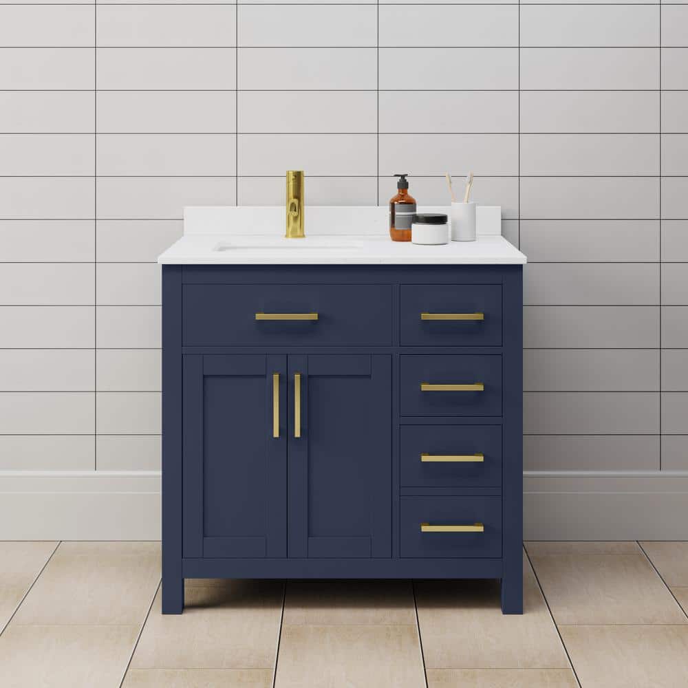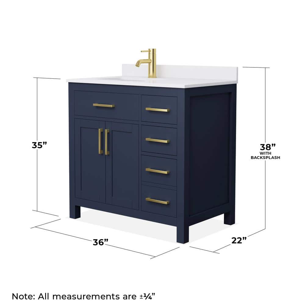 The Beckett 36" Single Sink Bathroom Vanity combines elegant design with practical functionality. Featuring a dark blue cabinet with brushed gold trim and a white cultured marble top, it offers ample storage and a durable construction. Perfect for enhancing any bathroom space.