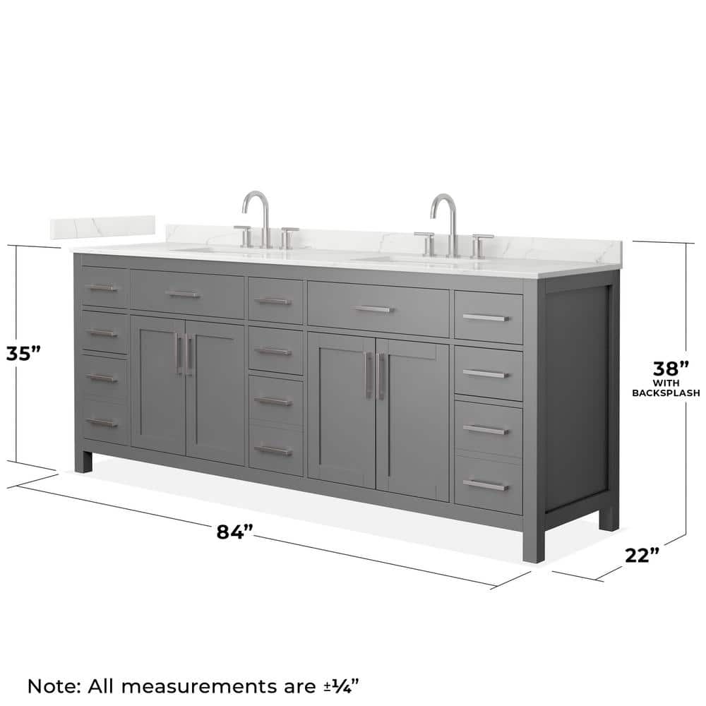 The Wyndham Collection Beckett 84 in. Double Freestanding Bath Vanity combines elegant design with practical functionality. Featuring a Giotto Quartz top, soft-close doors, and ample storage, this vanity is perfect for modern bathrooms.