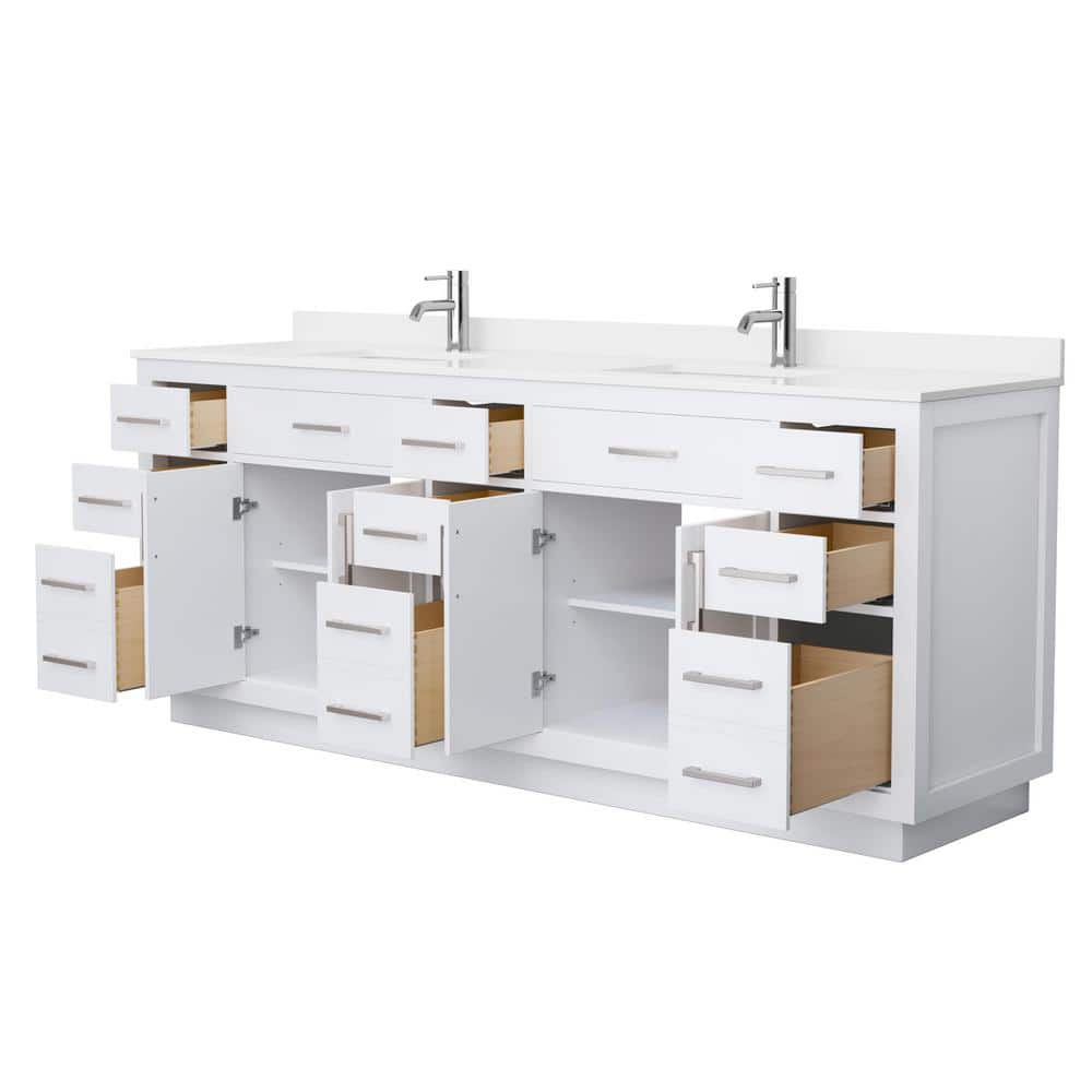 Wyndham Collection Beckett TK 84" Double Sink Bath Vanity with White Quartz Top and Brushed Nickel Trim