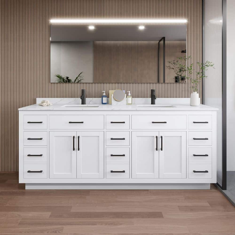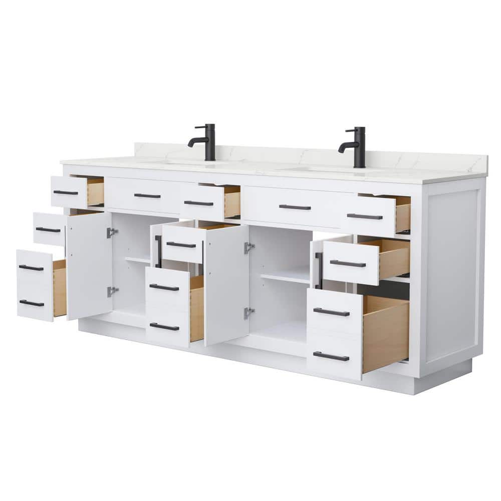 The Beckett TK Double Sink Vanity is a masterpiece of design and functionality. Its white cabinet with matte black trim exudes sophistication, while the Giotto quartz top adds a touch of luxury. Perfect for creating a spa-like retreat, this vanity offers ample storage with its thoughtfully designed drawers and doors. Pair it with sleek, modern fixtures to complete the look and transform your bathroom into a haven of style and comfort.