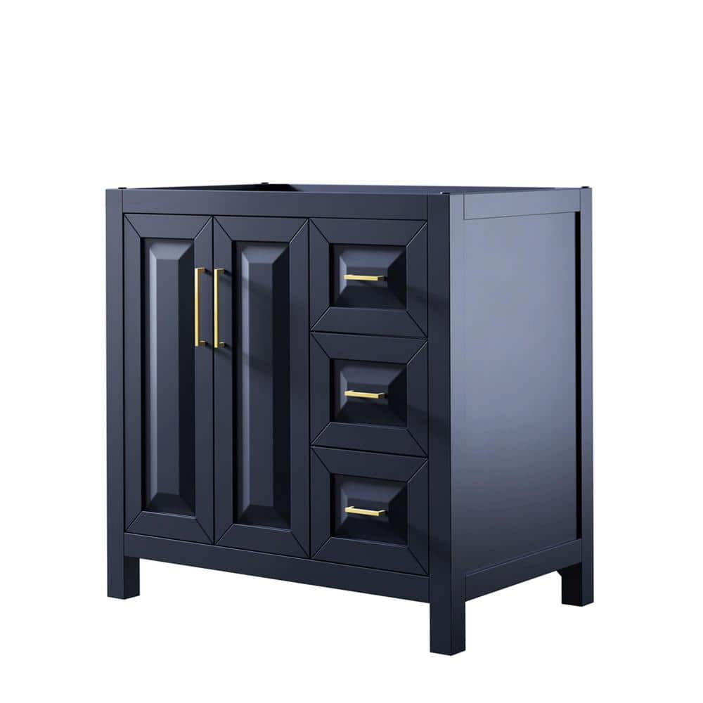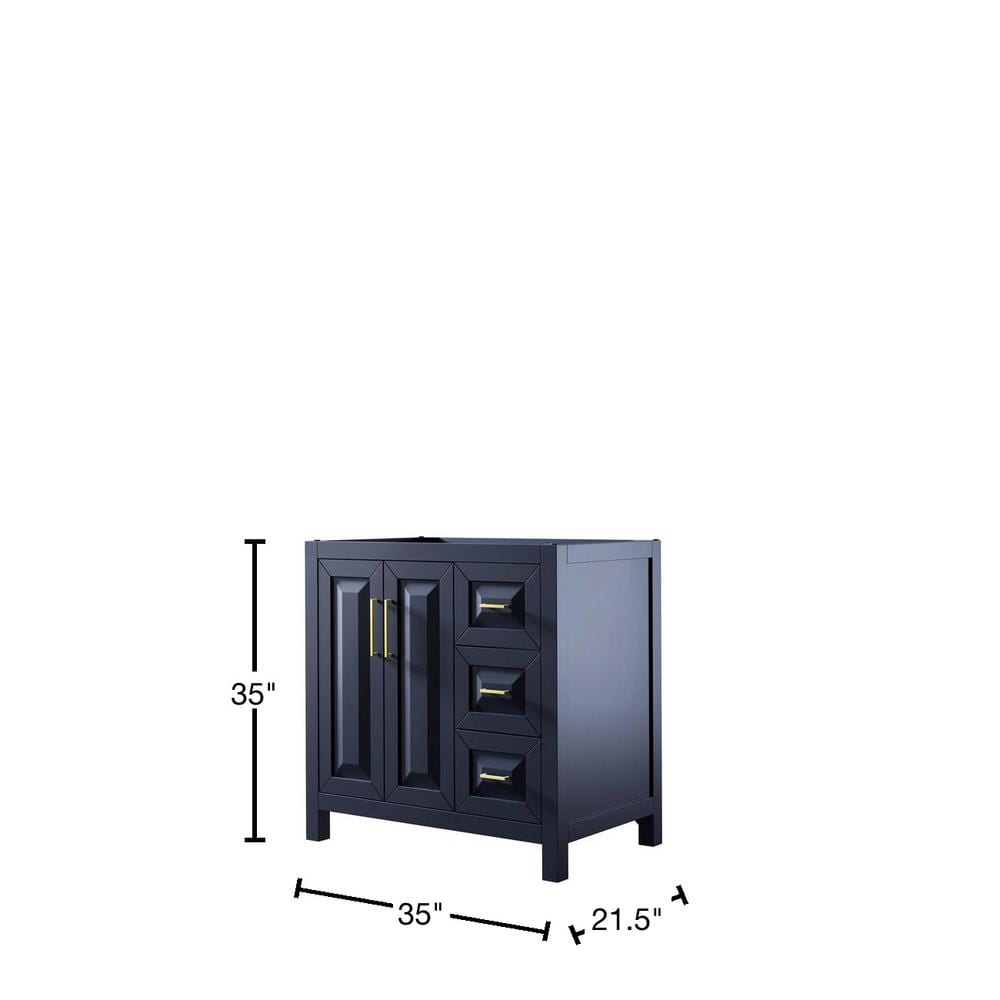 The Daria 35 in. Single Bathroom Vanity Cabinet by Wyndham Collection combines classic styling with modern functionality. Featuring a dark blue finish with brushed gold trim, it offers ample storage with soft-close doors and drawers. Perfect for enhancing any bathroom space.