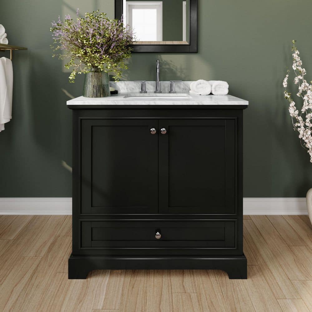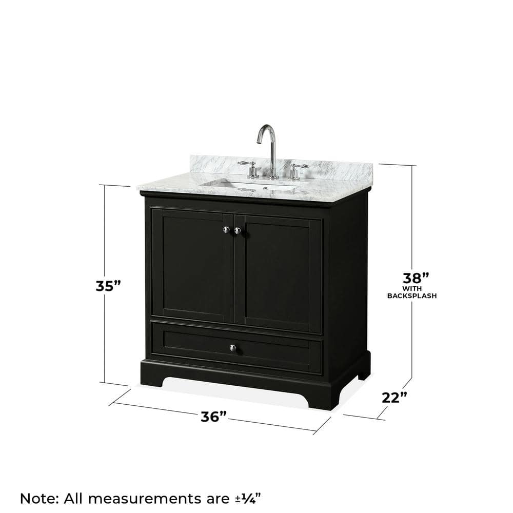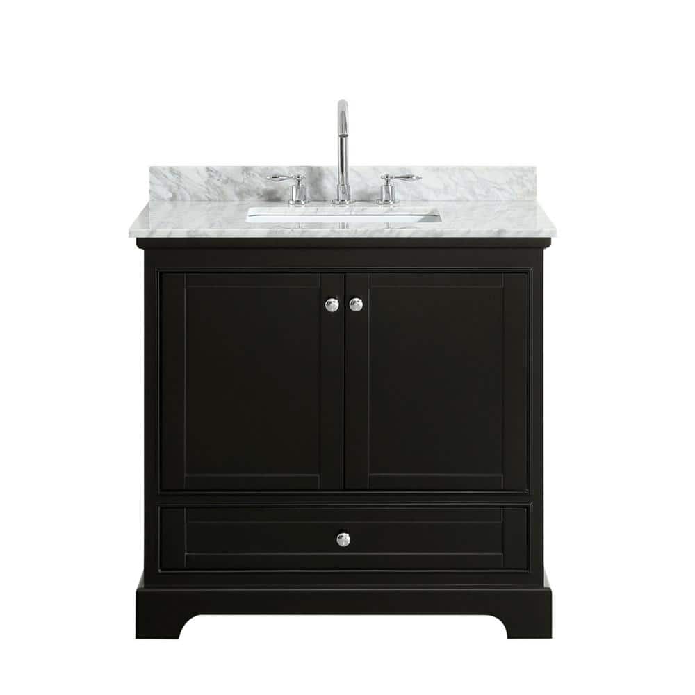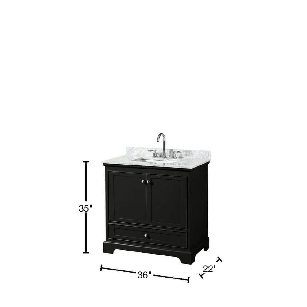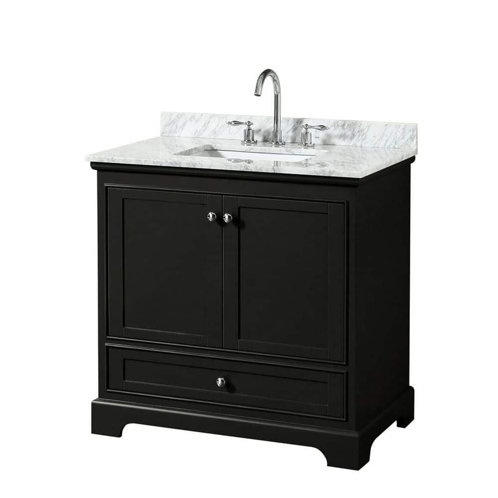 The Wyndham Collection Deborah 36" Bathroom Vanity combines traditional charm with modern functionality. Featuring a White Carrara marble top and a Dark Espresso finish, it offers ample storage and a sophisticated design.