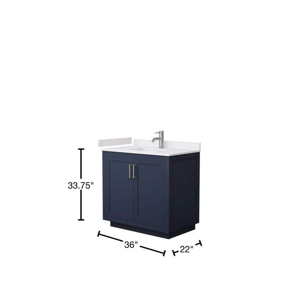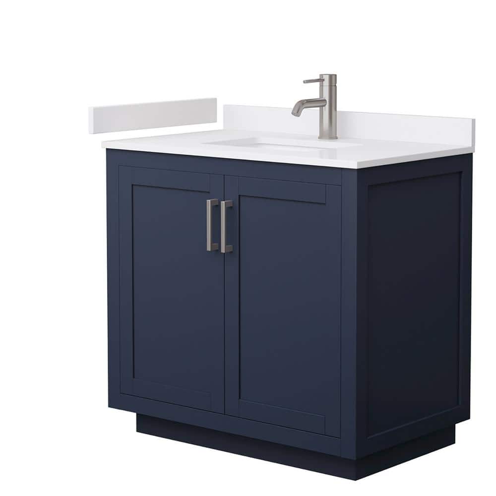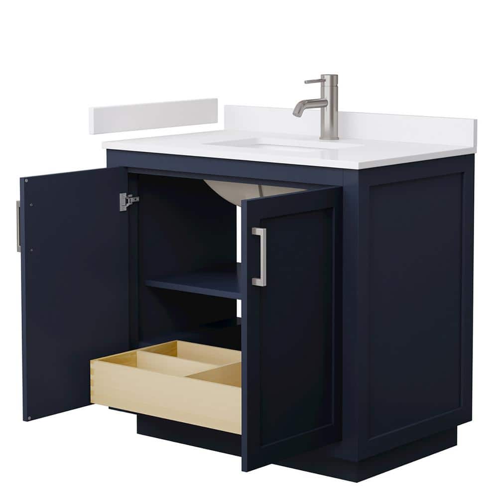 The Miranda 36" Bathroom Vanity by Wyndham Collection combines modern design with practical functionality. Featuring a dark blue finish, white cultured marble top, and ample storage, it is perfect for contemporary bathrooms.