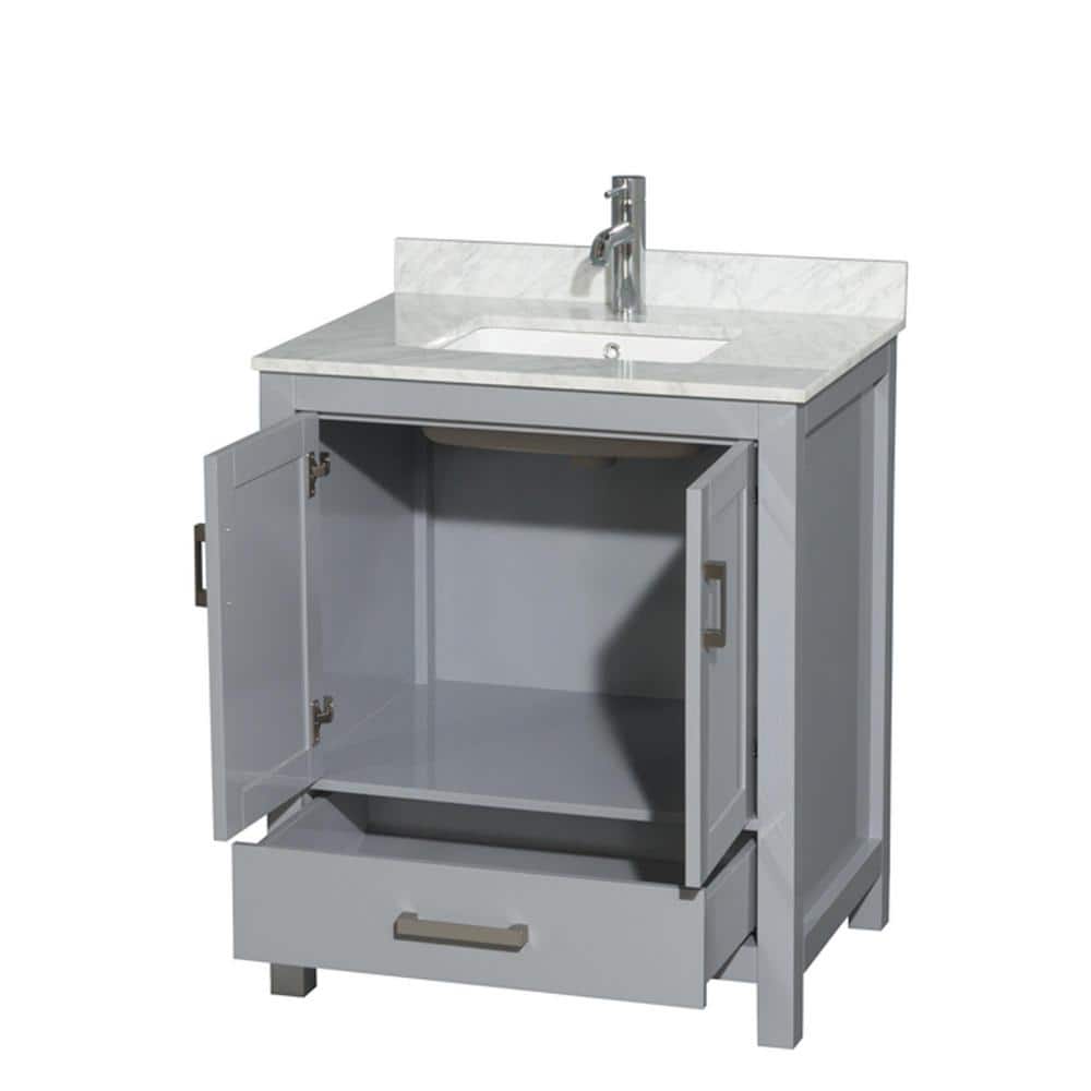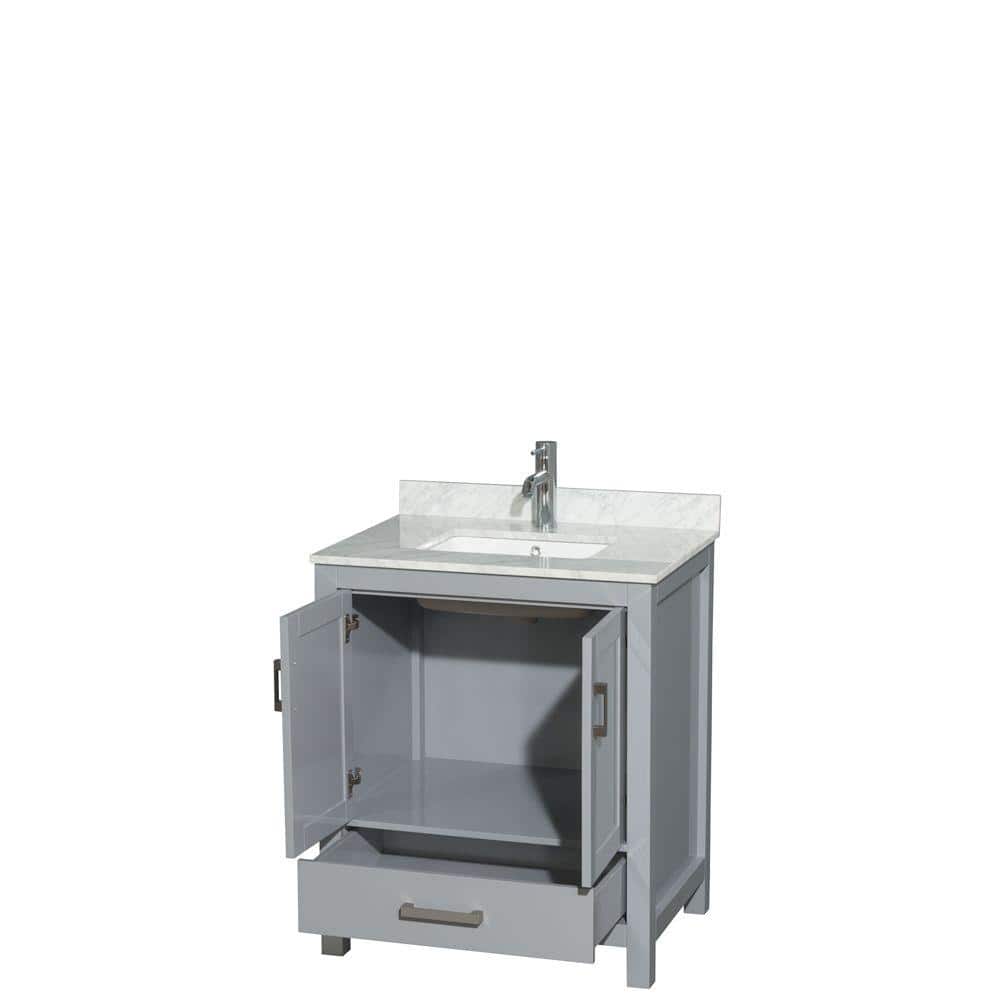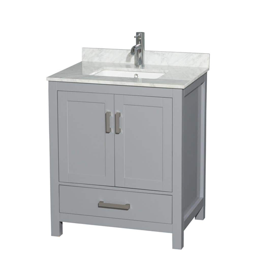 The Sheffield 30" Bath Vanity by Wyndham Collection combines modern design with classic elegance. Featuring a gray wood cabinet and a white Carrara marble top, it offers ample storage and a sophisticated look.