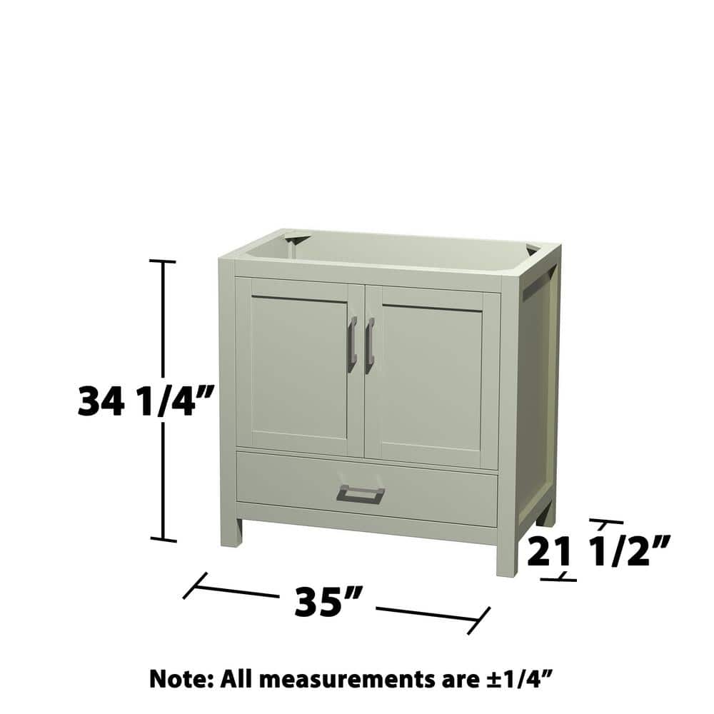 The Sheffield 35 in. Single Bath Vanity Cabinet by Wyndham Collection offers a stylish and functional addition to your bathroom. Crafted from solid wood with a light green finish, it features soft-close doors and drawers, brushed nickel hardware, and ample storage space.