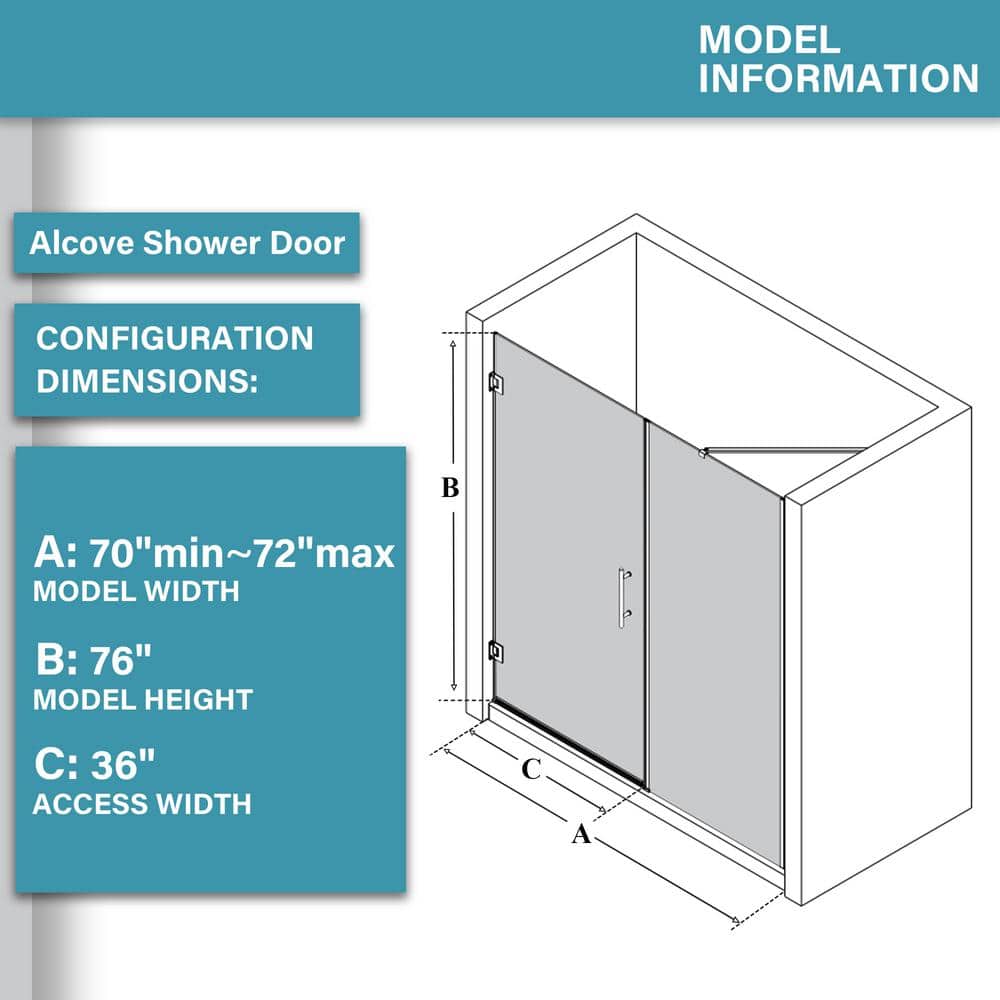 A: This shower door is designed to fit an installation width of 70 to 72 inches, accommodating most alcove setups.