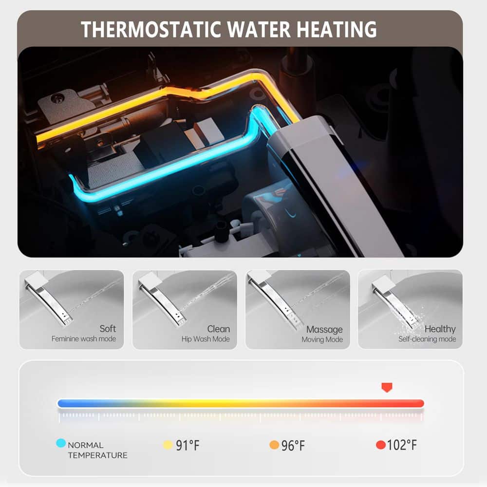 • Comfort Features: Heated seat, warm water wash, and gentle air dry for personalized comfort.
