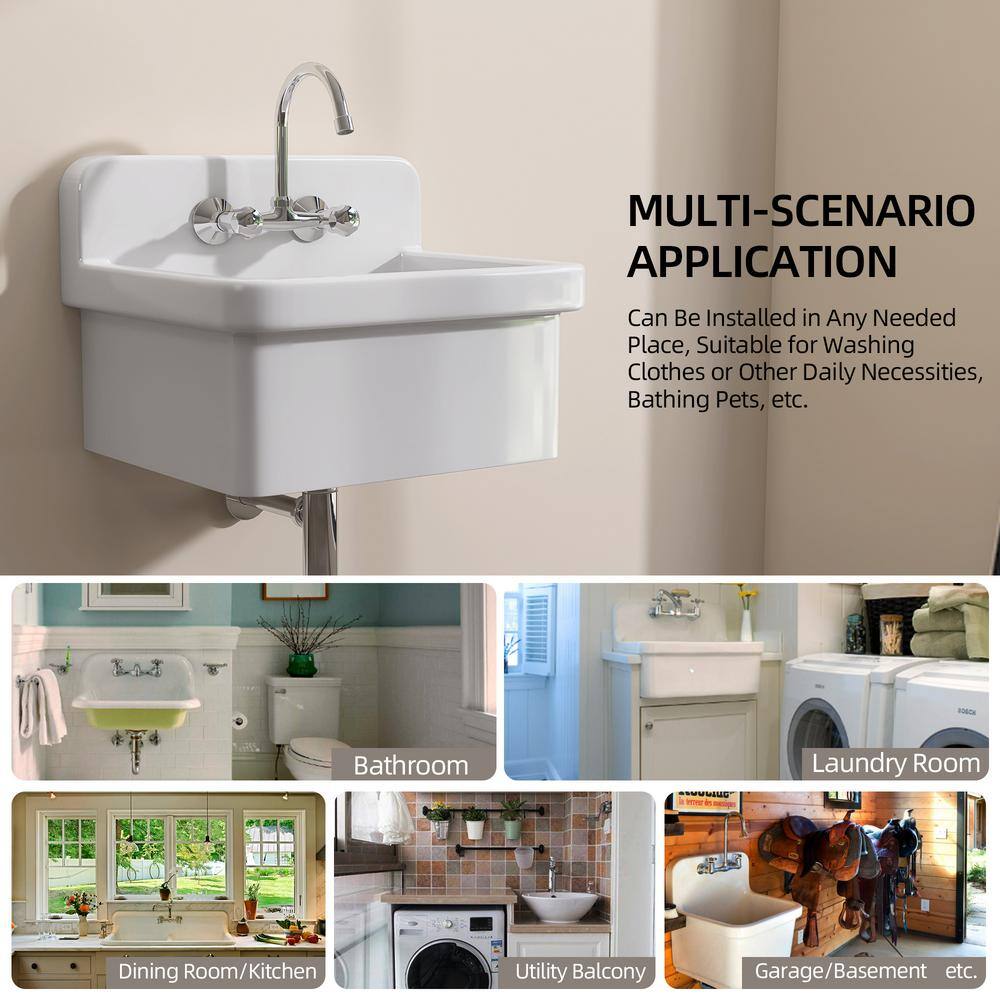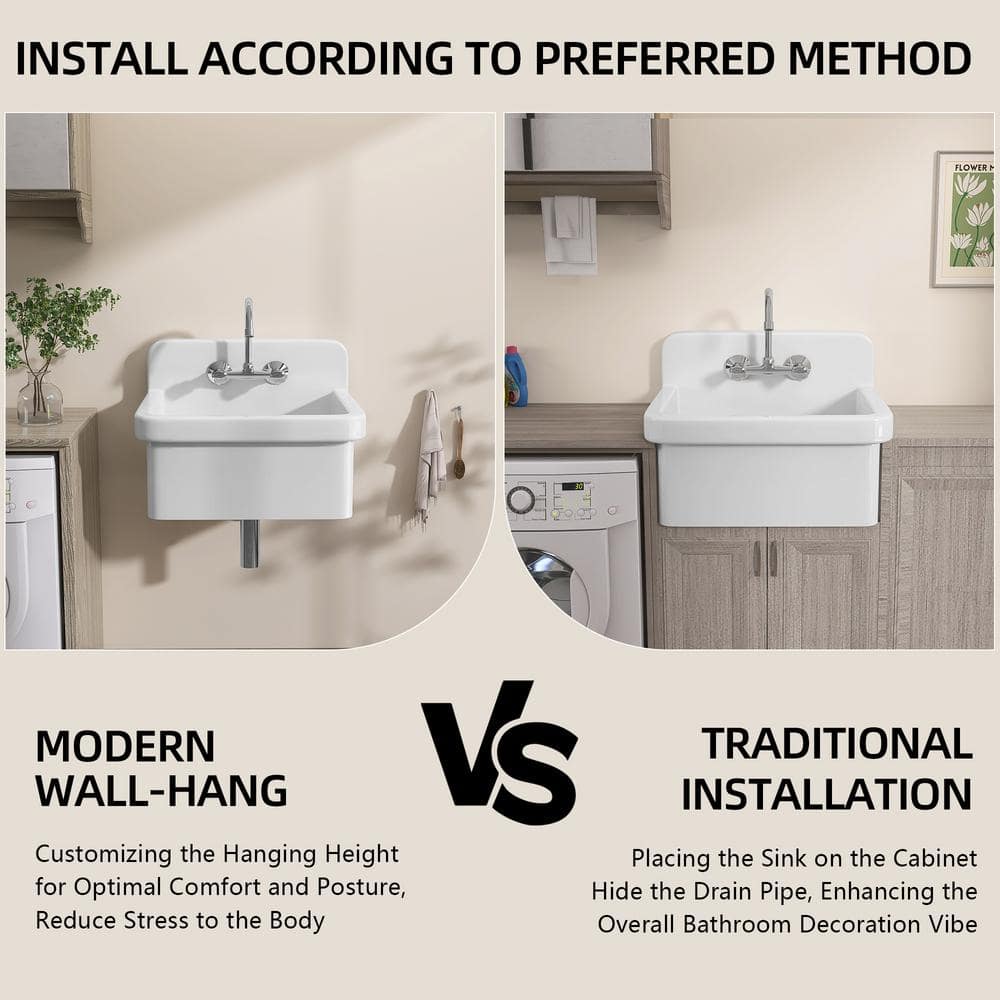The Zeafive 24'' Farmhouse Utility Sink is designed to bring both elegance and practicality to your laundry or utility room. Crafted from durable ceramic, this multipurpose sink handles heavy-duty tasks while maintaining its stylish white finish. Its versatile wall mounted or freestanding installation adapts to any space need, ensuring you get the most out of its spacious design.