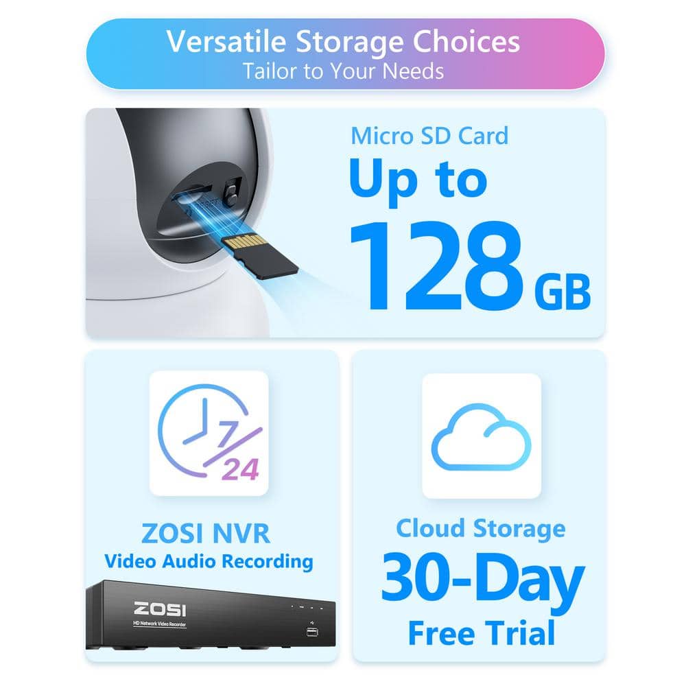 A: The camera supports multiple storage options, including cloud storage, SD card, and ZOSI NVR, providing flexibility in how you save and manage your recordings.