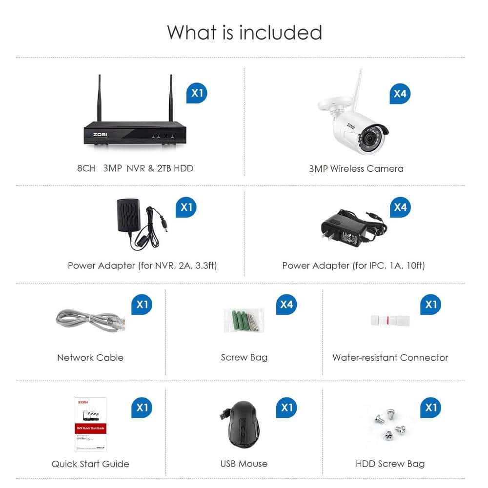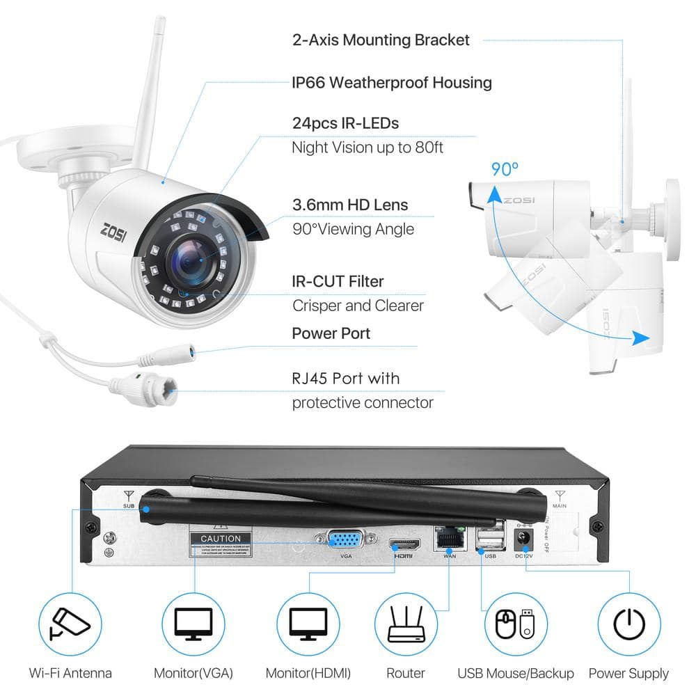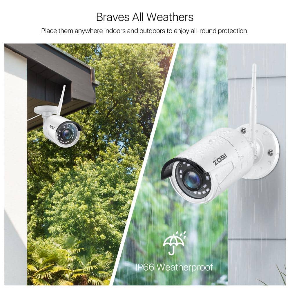 Elevate your security with the ZOSI 8-Channel 2K NVR Security Camera System, designed to protect both home and commercial spaces effortlessly. This robust system comes with four wireless bullet cameras and a 1TB hard drive, ensuring high-resolution footage and seamless remote access. Engineered for easy DIY installation, this weatherproof IP66-rated security solution keeps you connected and secure day or night.