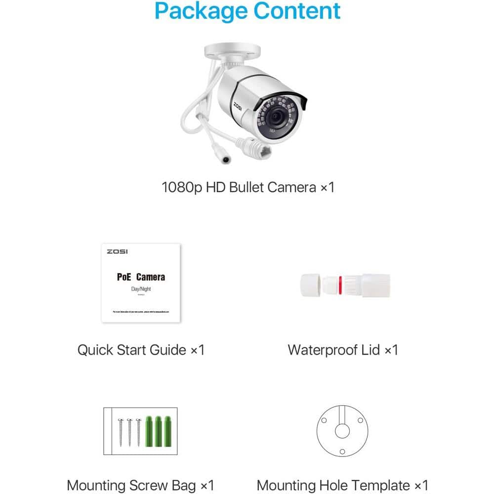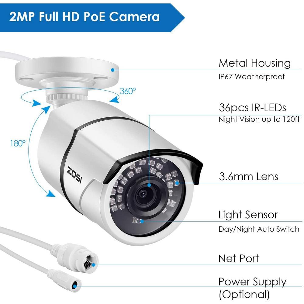 The ZOSI ZG2612D 1080P PoE Outdoor Security IP Camera offers unparalleled protection for your home or business with high-definition 1080p video quality and robust night vision capabilities. Designed to work exclusively with ZOSI PoE NVR systems, it features a durable, waterproof construction suitable for all weather conditions, ensuring continuous surveillance day and night.