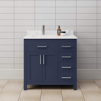 Wyndham Collection Beckett 36" Dark Blue Bathroom Vanity with Carrara Marble Top