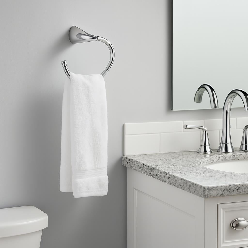 The KOHLER Alteo Towel Ring features a polished chrome finish and durable brass construction, ensuring long-lasting use and a sleek, modern look. Its open-ended design allows for easy towel access, making it a practical and stylish addition to any bathroom.