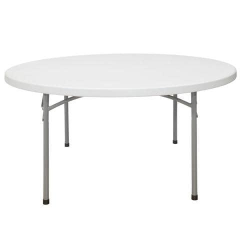 Professional grade blow molded folding table 71-in round engineered for commercial catering use 19-Gauge strength frame and legs Lightly spotted grey top with grey textured powder coated wishbone style legs 700 lb weight capacity Withstands heat up to 212 °F 2-In thick top for added strength Lightly textured surface to resist scratching yet smooth enough to write on Store 8 tables on transport cart item number 599827 10 Year limited warranty