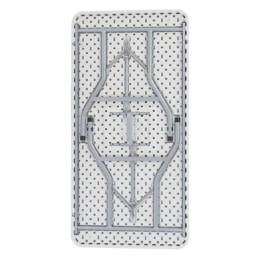 Professional grade blow molded folding table 30 x 60-in engineered for commercial catering use 17 gauge steel frame Lightly spotted grey top with grey textured powder coated wishbone style legs 1000 lb weight capacity Withstands heat up to 212 °F 1.75-in thick top for added strength Lightly textured surface to resist scratching yet smooth enough to write on Store up to 12 tables on transport cart item number 599819 10 year limited warranty
