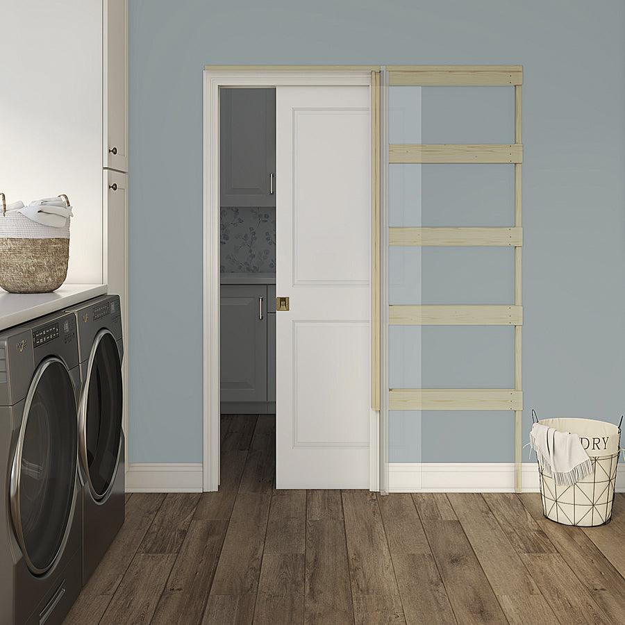 Wooden built up pocket frame and hardware Designed for 28 in x 80 in interior slabs up to 150 pounds Designed for doors 1 in to 1-3/8 in thick Heavy gauge, steel stiffener reinforces split jambs Jump proof aluminum track for easy operation Easy adjustment after installation
