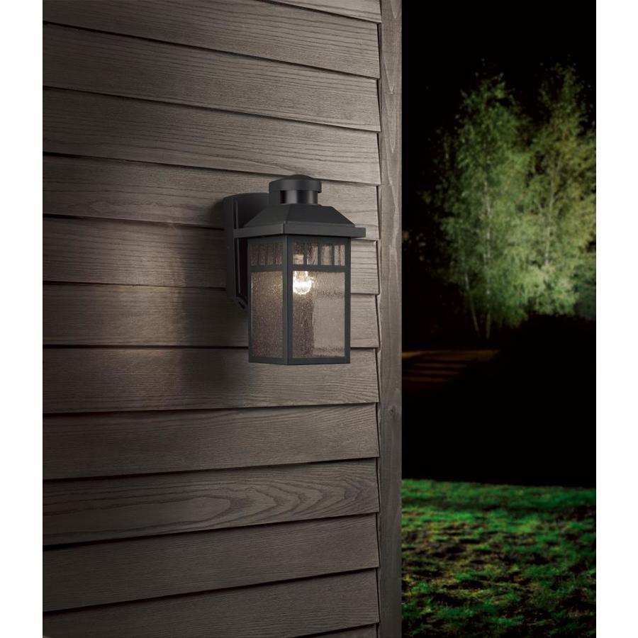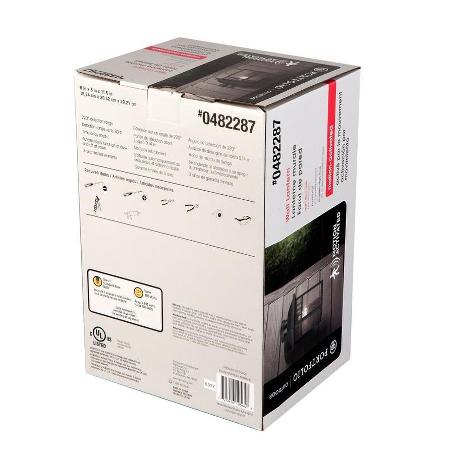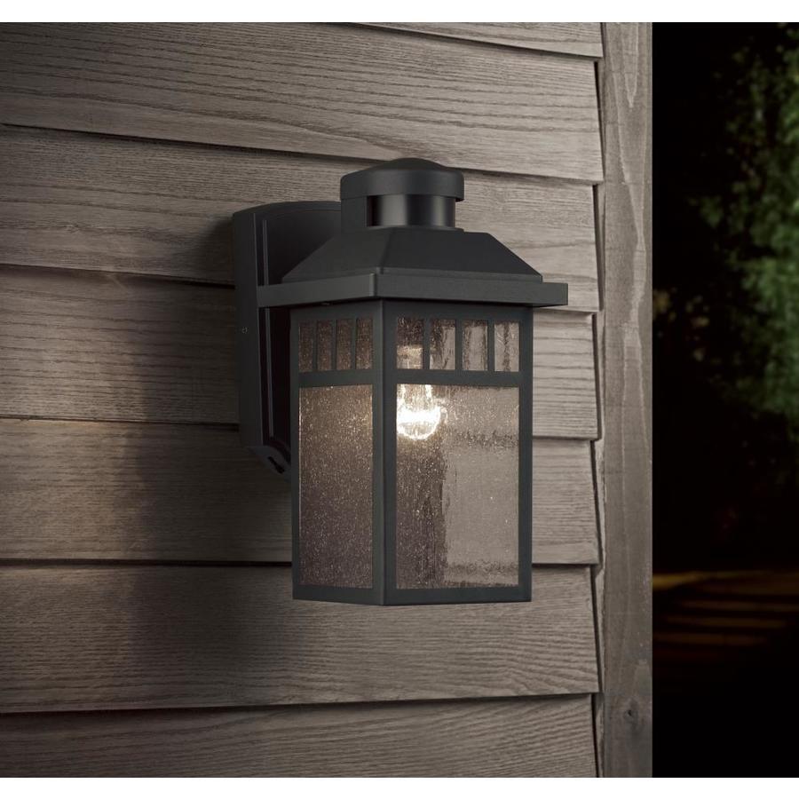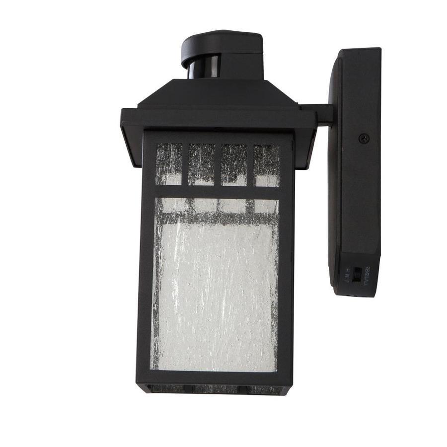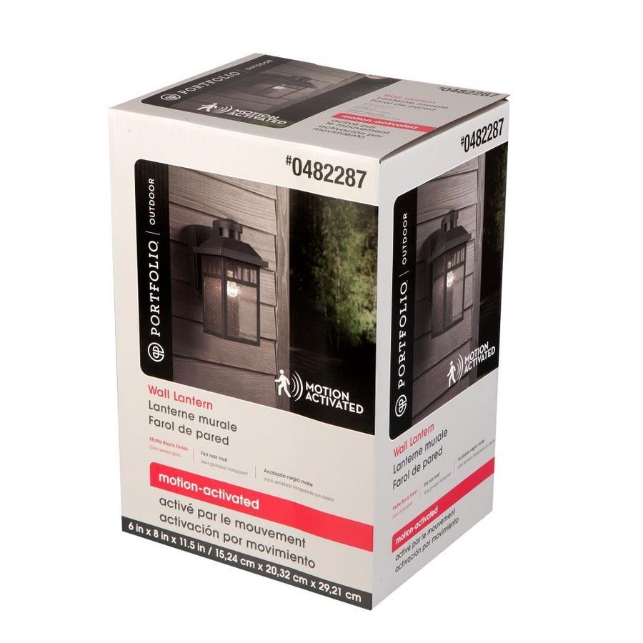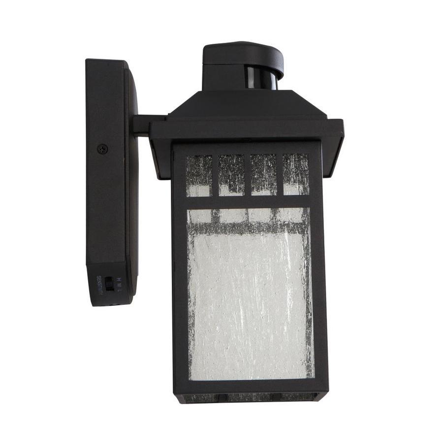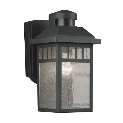 Black finish motion activated outdoor wall light is weather-resistant and sturdy Clear seeded glass allows for brightly illuminating your outdoors One 100 watt medium base incandescent bulb required (not included) 220 ° motion-activated sensor detects movement up to 30-f Dusk-to-dawn sensor automatically turns the light on at dusk and off at dawn for convenience and energy savings 6-in W x 11.5-in H x 8-in D UL safety listing demonstrates this product has met minimum requirements of widely accepted product safety standards Great for traditional style decor Wet location rated