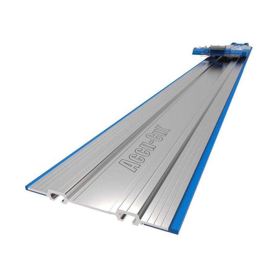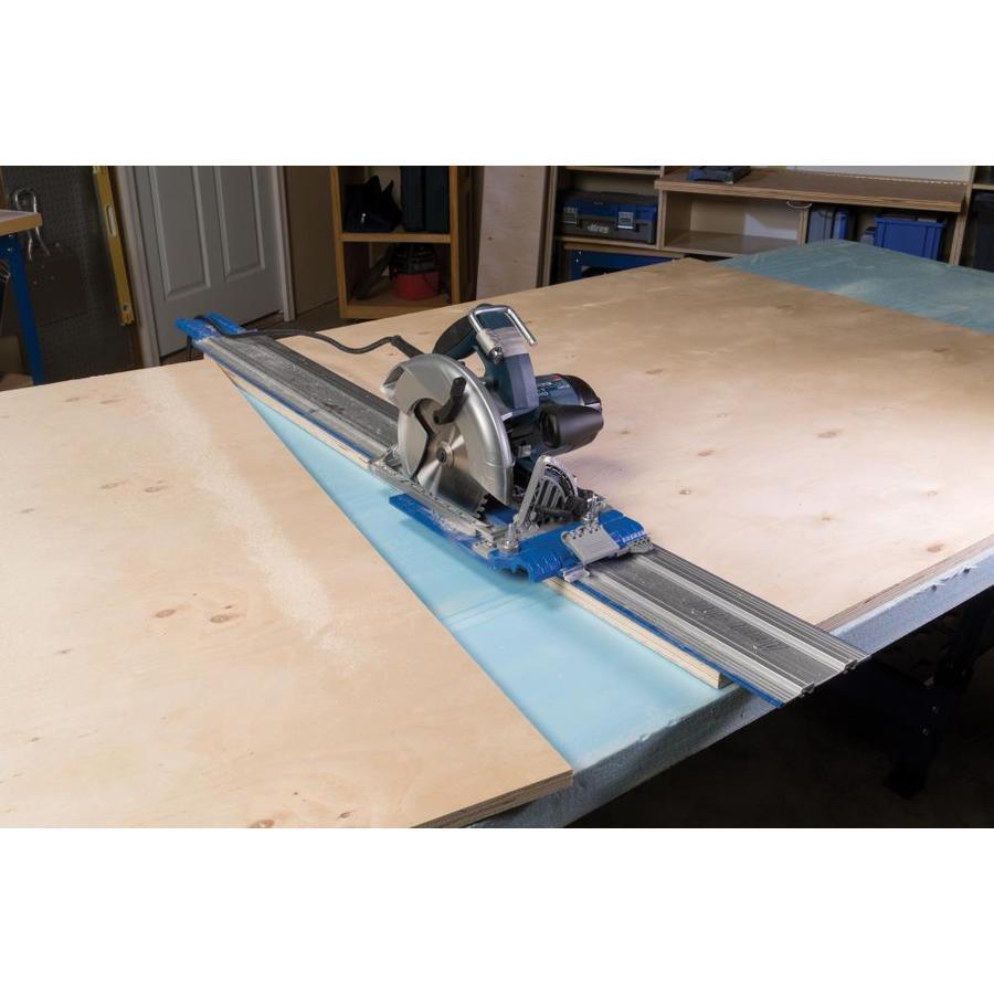 Rips, crosscuts, and makes angled cuts up to 48-in Universal saw plate accepts most circular saws—left or right blade Starting block supports saw at beginning of cut Two-piece precision saw track (26.5 In. each, 53 In. total) Durable anti-slip/anti-chip strips hold track in place, prevent splintering Simple one-time setup Saw can be removed and reinstalled quickly and easily Optional clamps for use on bowed, rough, or dirty plywood