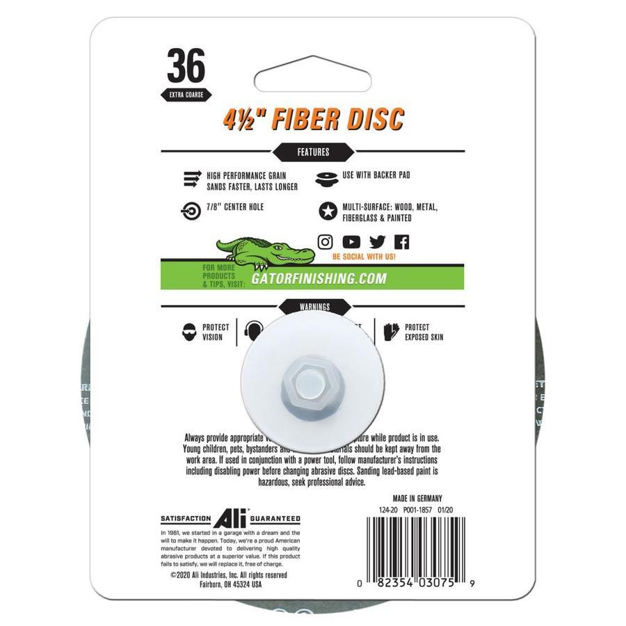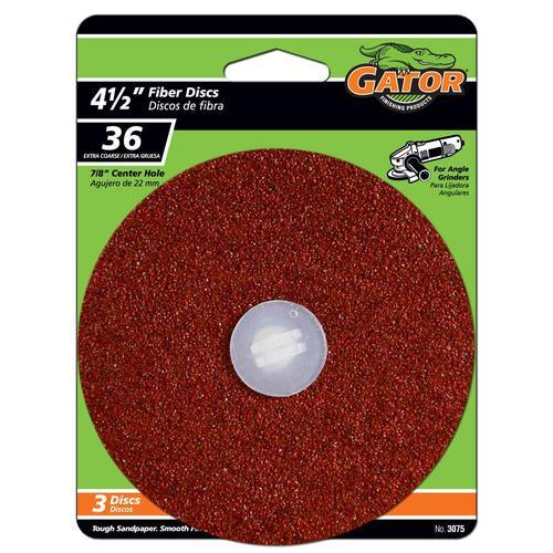 36 Grit fiber disc are best for heavy removal of coating and rust For use with a 4-1/2 In. right angle grinder (RAG) with a fiber disc backer pad Made with a tough aluminum oxide grain which is recommended by professionals for sanding a wide variety of surfaces The heavy duty fiber backing holds up with even the toughest jobs The double resin bonding system resists heat and humidity, extending the life of the fiber disc The fiber disc has a 4-1/2 in. diameter with a 7/8 In. center hole