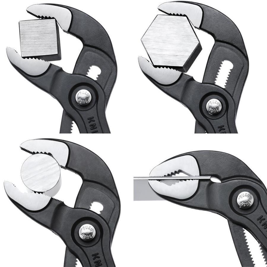 7-1/4-in overall length Thin head fits into tight places Gripping surface with special hardened teeth - (Approx. 61 HRC) wear resistant and grips any shape object Self-locking on pipes and nuts - no slipping off the workpiece, no knuckle-busting Push-button mechanism - adjust once and it stays set, perfect for use during repetitive work 1-1/2-in gripping capacity, 18 adjustment positions Fine adjustment - optimum adjustment to different size workpieces Forged box joint design for very high stability Pinch guard - protects against finger and hand pitching