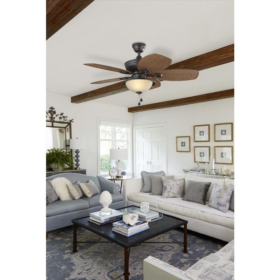 Bronze indoor/outdoor ceiling fan from the Cedar Shoals collection features 5 blades with a Tropical design Frosted light kit brings overhead illumination to your space 3 speed settings make it easy to maintain the ideal comfort level Included pull chains allow you to control the light and fan speed quickly and easily Reverse air flow feature allows you to change the fan’s direction setting seasonally, so cool air is pushed down or warm air is distributed evenly 4-in L downrod included (can also be installed as a close or angle mount) ETL listed for use in wet locations Limited lifetime warranty gives you peace of mind