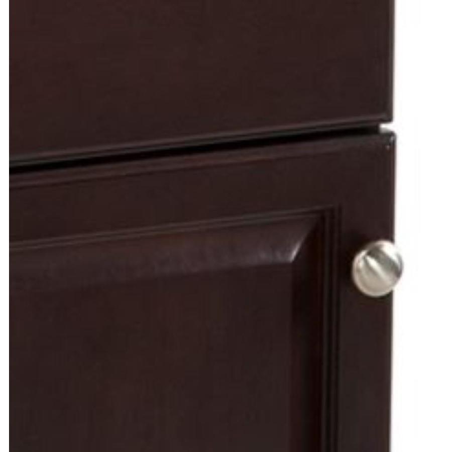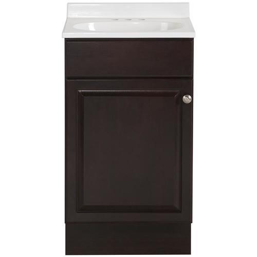 Java finish vanity complements a variety of color palettes Cultured marble top with integrated bowl for a seamless, one-piece design Great for traditional style decor Pre-drilled for a 4-in centerset faucet for easy installation (faucet sold separately) Brushed nickel finish hardware adds a shiny touch Two raised-panel cabinet doors with 6-way adjustable hinges provide access to interior storage Fully assembled and ready to be installed