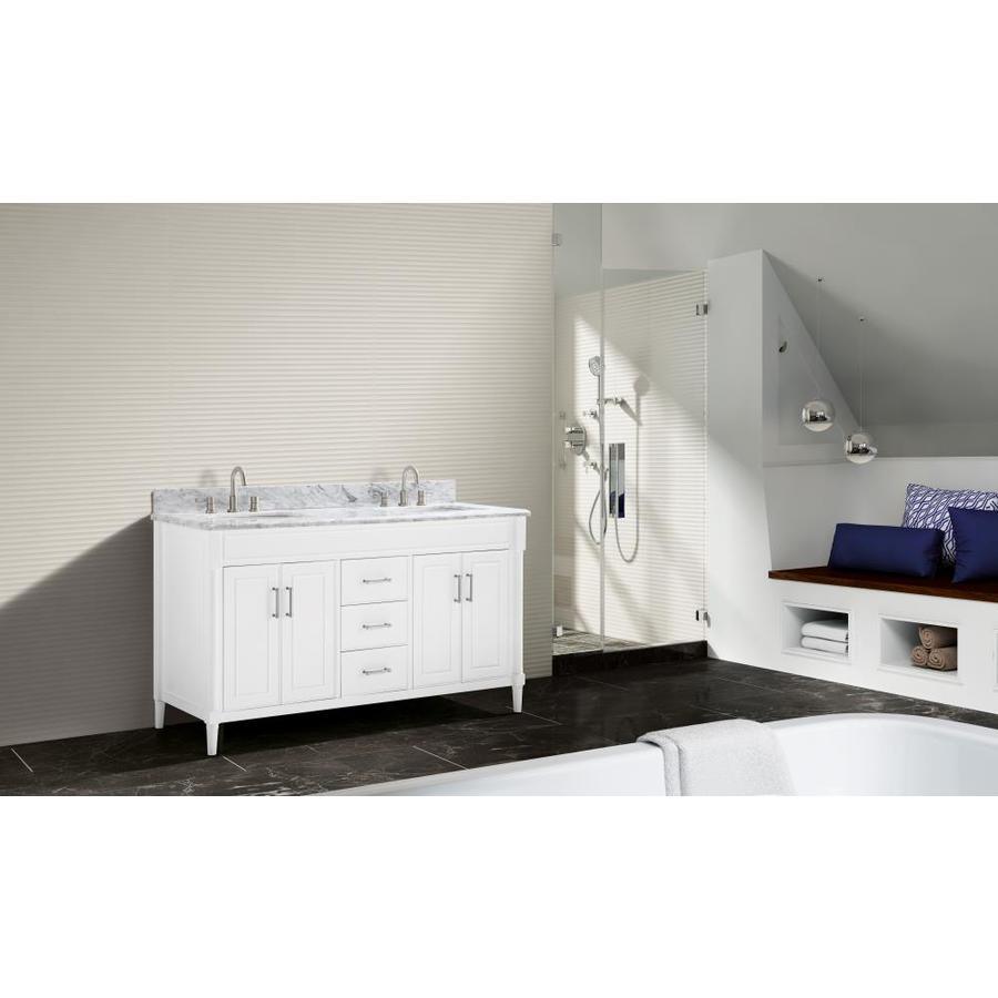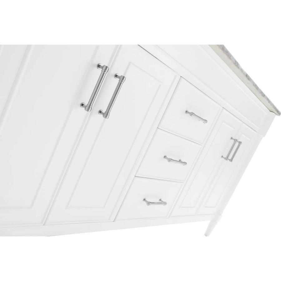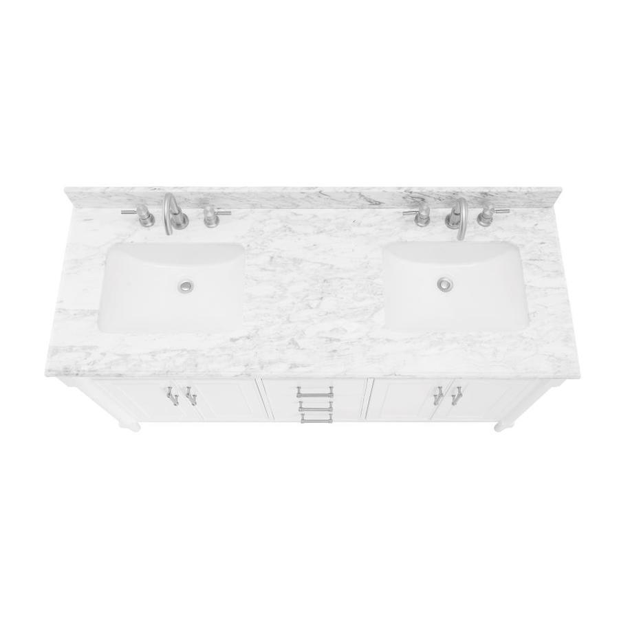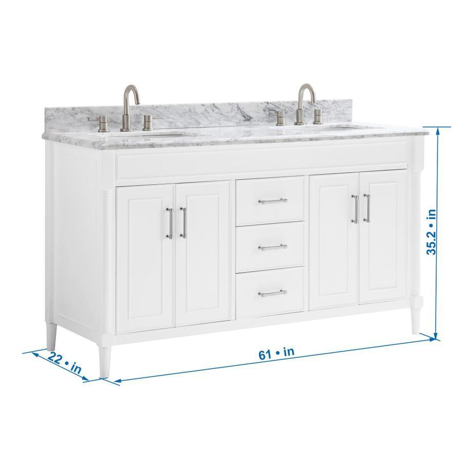 61W x 22D x 34.8H inches 4 soft-close doors and 3 soft-close drawers Adjustable height levelers Solid rubber wood, MDF and plywood Brushed nickel finish hardware White finish Top pre-drilled for 8 in. widespread faucet; facuet not included Dual white vitreous china rectangular undermount sinks 1.5 in. Carrera white marble top with laminated edge and backsplash