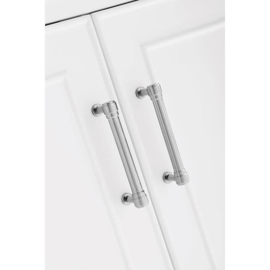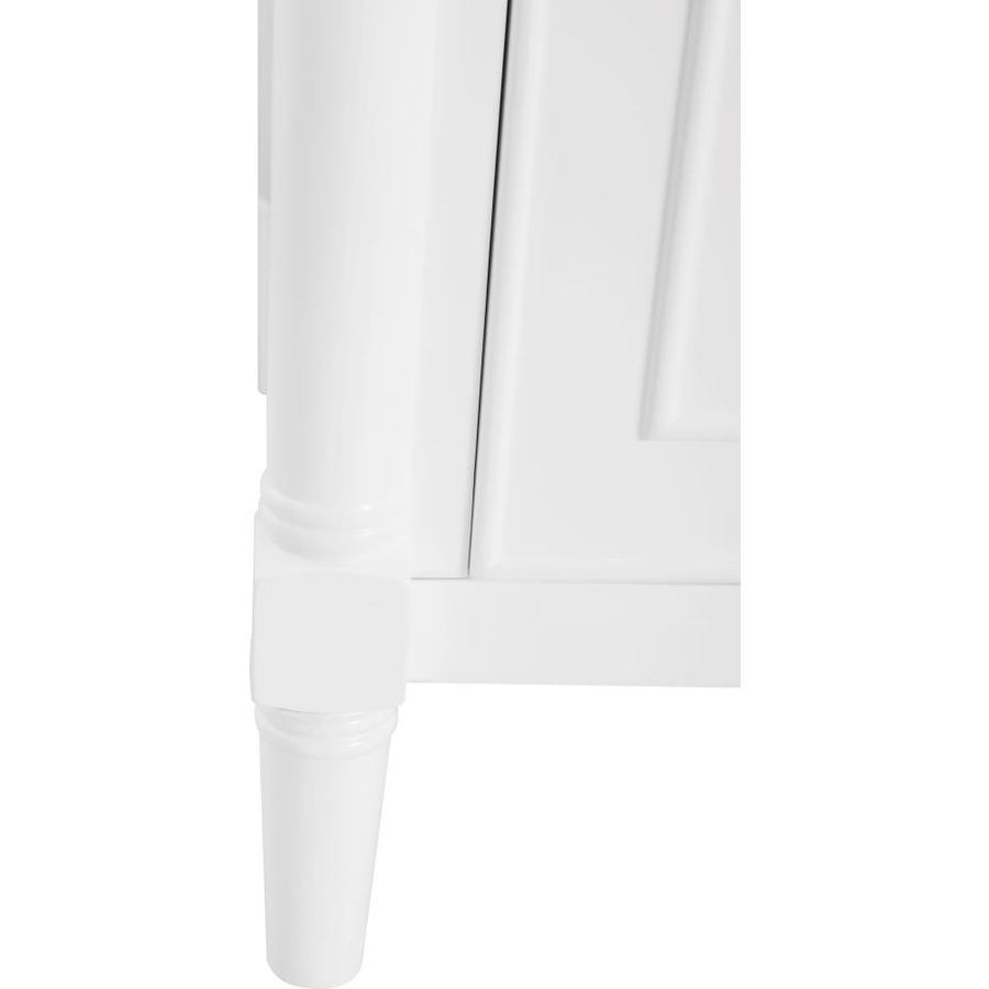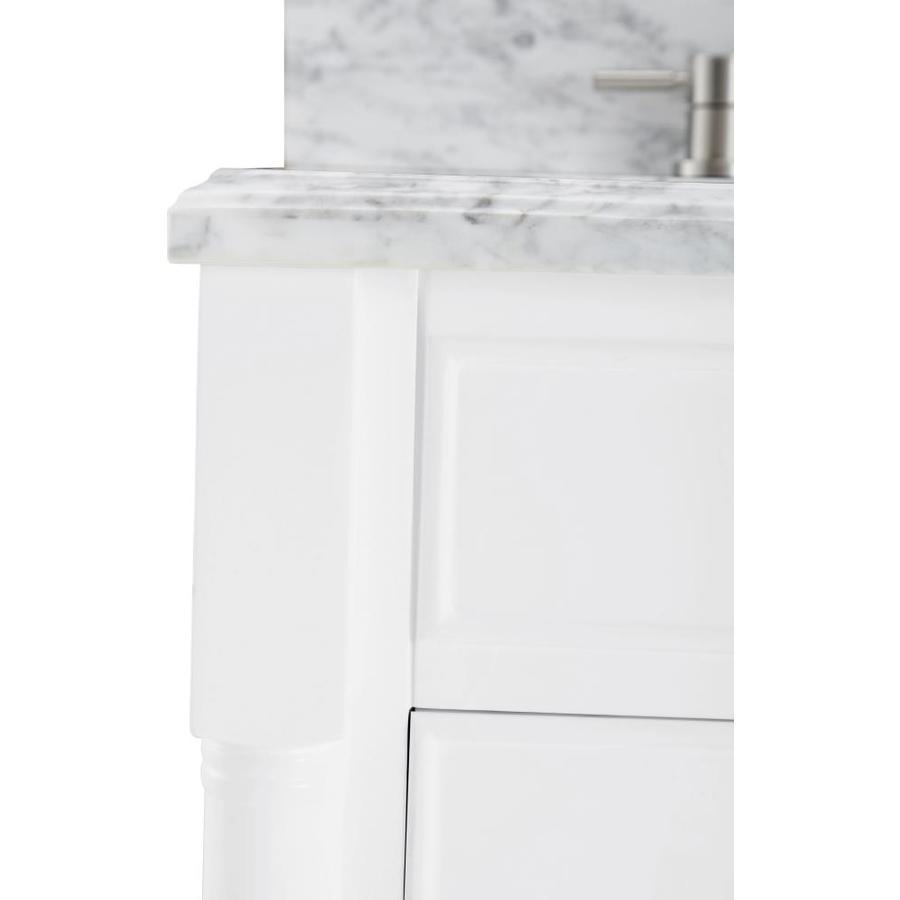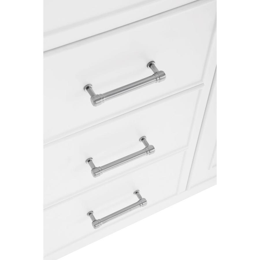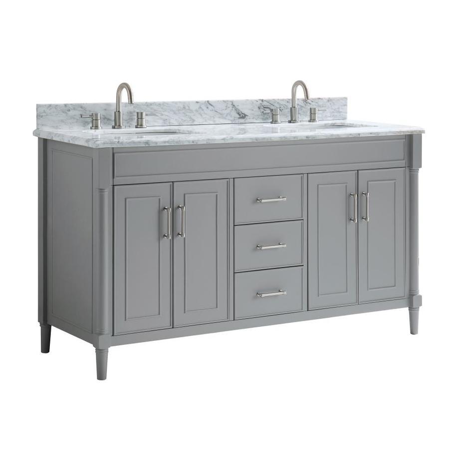 61W x 22D x 34.8H inches 4 soft-close doors and 3 soft-close drawers Adjustable height levelers Solid rubber wood, MDF and plywood Brushed nickel finish hardware White finish Top pre-drilled for 8 in. widespread faucet; facuet not included Dual white vitreous china rectangular undermount sinks 1.5 in. Carrera white marble top with laminated edge and backsplash
