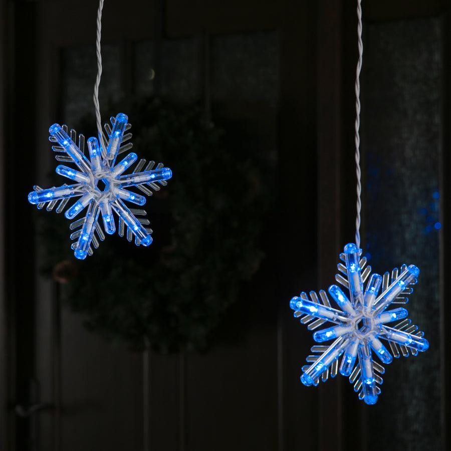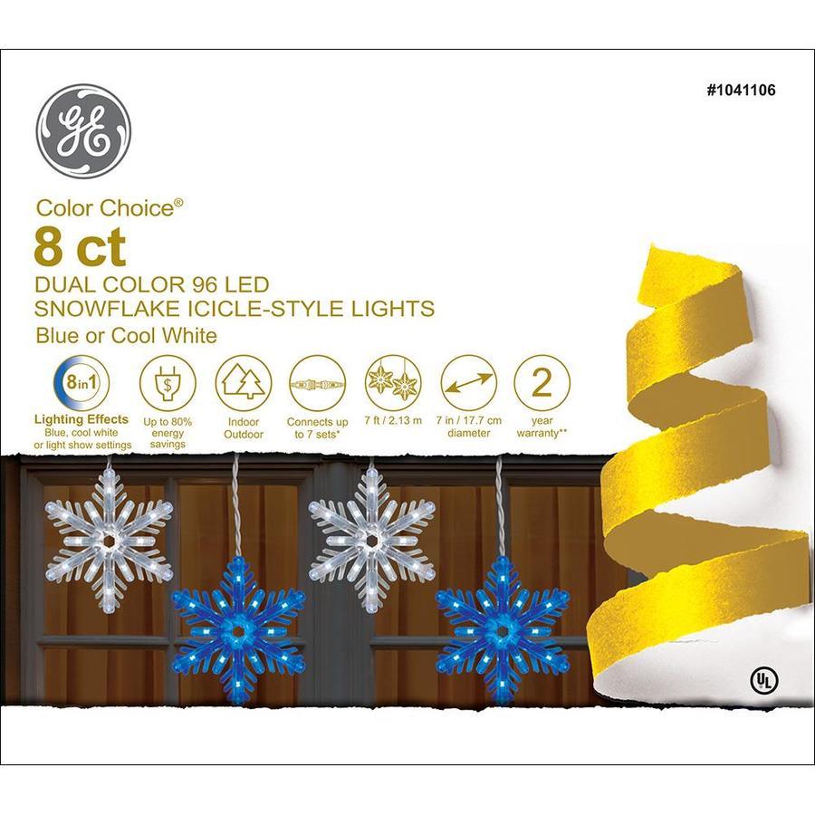 8 GE 7-Inch LED Color Choice snowflake icicles Use control box to choose blue, cool white or light show With LED lights you get up to 80% energy savings Connects up to 7 sets White cord set with fused plug and 12-Inch lead wire Replacement bulbs and fuses included for added convenience Available only at ARB265W