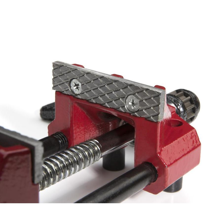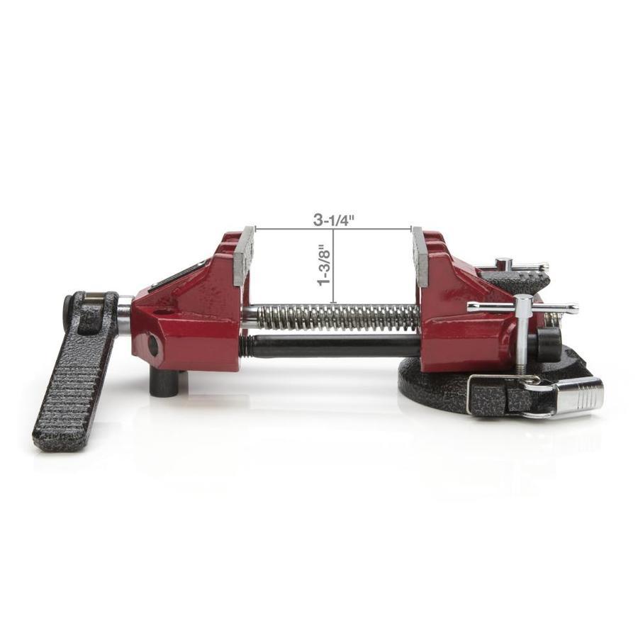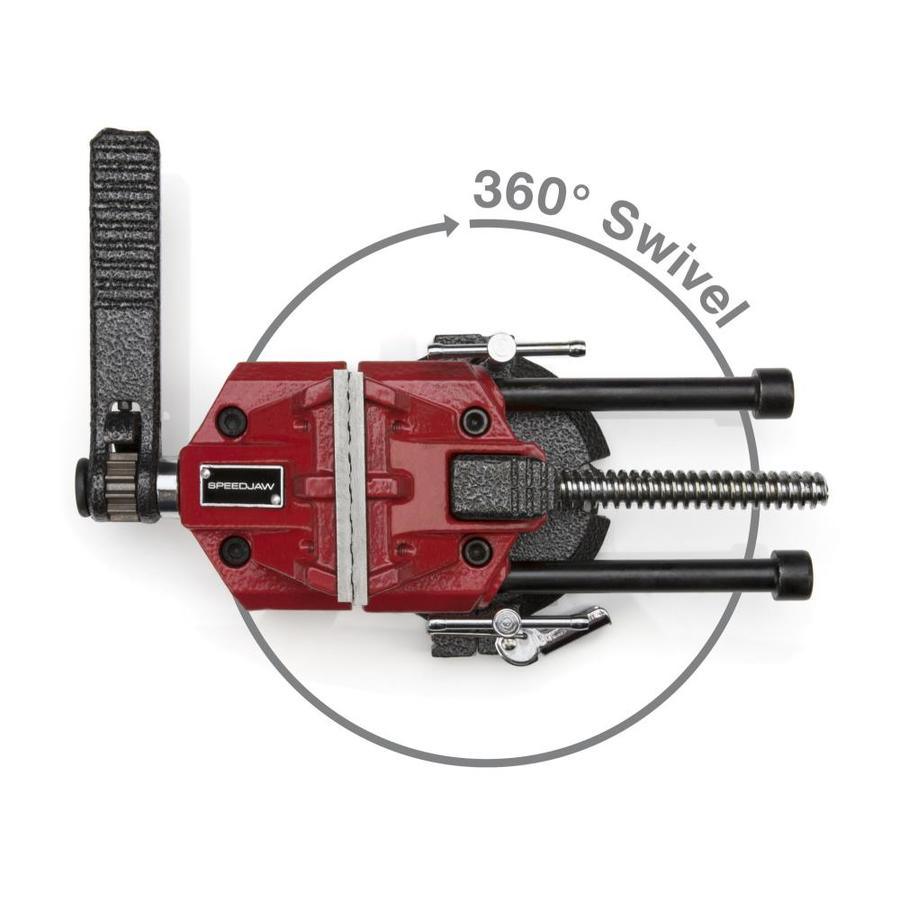 RAPID OPENING - rapid open and close feature saves time with fast adjustments DURABLE STEEL JAWS - durable tool steel serrated vise jaws are replaceable and provide a secure, non-slip grip 3-INCH JAWS - 3-inch wide jaws open to a maximum of 3-1/4-inches with a 1-3/8-inch throat depth RATCHETING HANDLE - ratcheting handle allows fine adjustment and increased mounting options beyond the edge of a work bench DETACHABLE BASE MOUNT - unit clamps onto a 360-degree inscribed posi-clock disc that allows for precise rotation and lets the vise be stored out of the way when not in use CAST DUCTILE IRON - vise is made from high-strength, powder-coated cast ductile iron that can stand up to long use COMPATIBLE VISE PADS - compatible with SPEEDJAW 93162 Curved, 93163 Ductile Iron, and 93164 Non-Marring vise pads