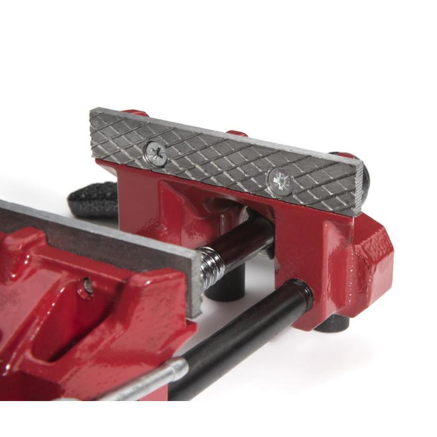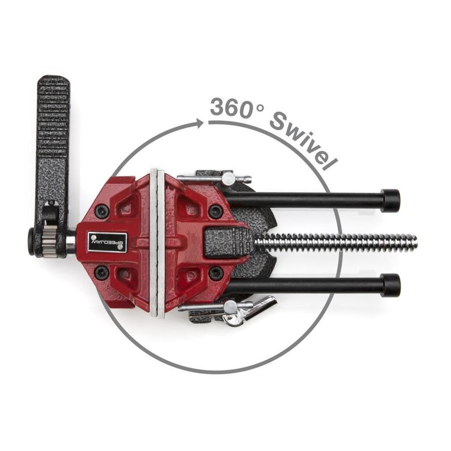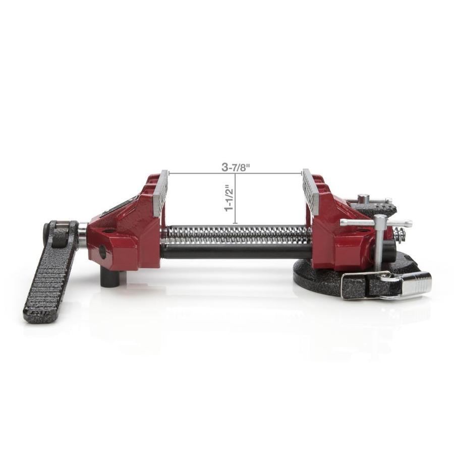 RAPID OPENING - Rapid open and close feature saves time with fast adjustability DURABLE STEEL JAWS - Durable tool steel serrated vise jaws are replaceable and provide a secure, non-slip grip 4-INCH JAWS - 4-inch wide jaws open to a maximum of 3-7/8-inches with a 1-1/2-inch throat depth RATCHETING HANDLE - Ratcheting handle allows fine adjustment and increased mounting options beyond the edge of a work bench DETACHABLE BASE MOUNT - Unit clamps onto a 360-degree inscribed posi-clock disc that allows for precise rotation and lets the vise be stored out of the way when not in use CAST DUCTILE IRON - Vise is made from high-strength, powder-coated cast ductile iron that can stand up to long use COMPATIBLE VISE PADS - Compatible with SPEEDJAW 93095 Curved, 93096 Ductile Iron, and 93097 Non-Marring vise pads