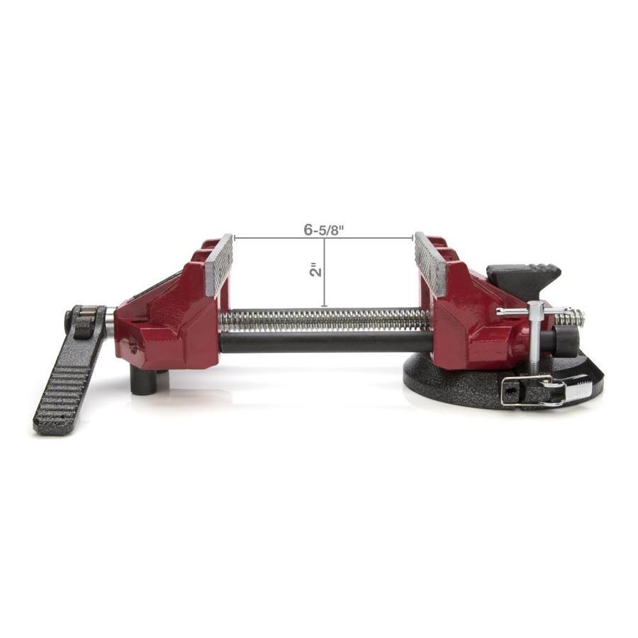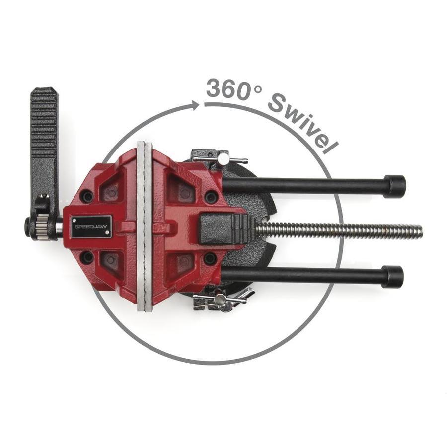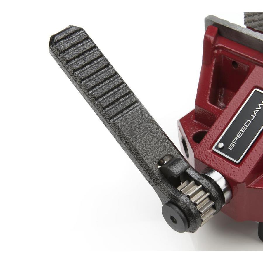 RAPID OPENING - Rapid open and close feature saves time with fast adjustability DURABLE STEEL JAWS - Durable tool steel serrated vise jaws are replaceable and provide a secure, non-slip grip 6-INCH JAWS - 6-inch wide jaws open to a maximum of 6-5/8-inches with a 2-inch throat depth RATCHETING HANDLE - Ratcheting handle allows fine adjustment and increased mounting options beyond the edge of a work bench DETACHABLE BASE MOUNT - Unit clamps onto a 360-degree inscribed posi-clock disc that allows for precise rotation and lets the vise be stored out of the way when not in use CAST DUCTILE IRON - Vise is made from high-strength, powder-coated cast ductile iron that can stand up to long use COMPATIBLE VISE PADS - Compatible with SPEEDJAW 93171 Curved, 93172 Ductile Iron, and 93173 Non-Marring vise pads
