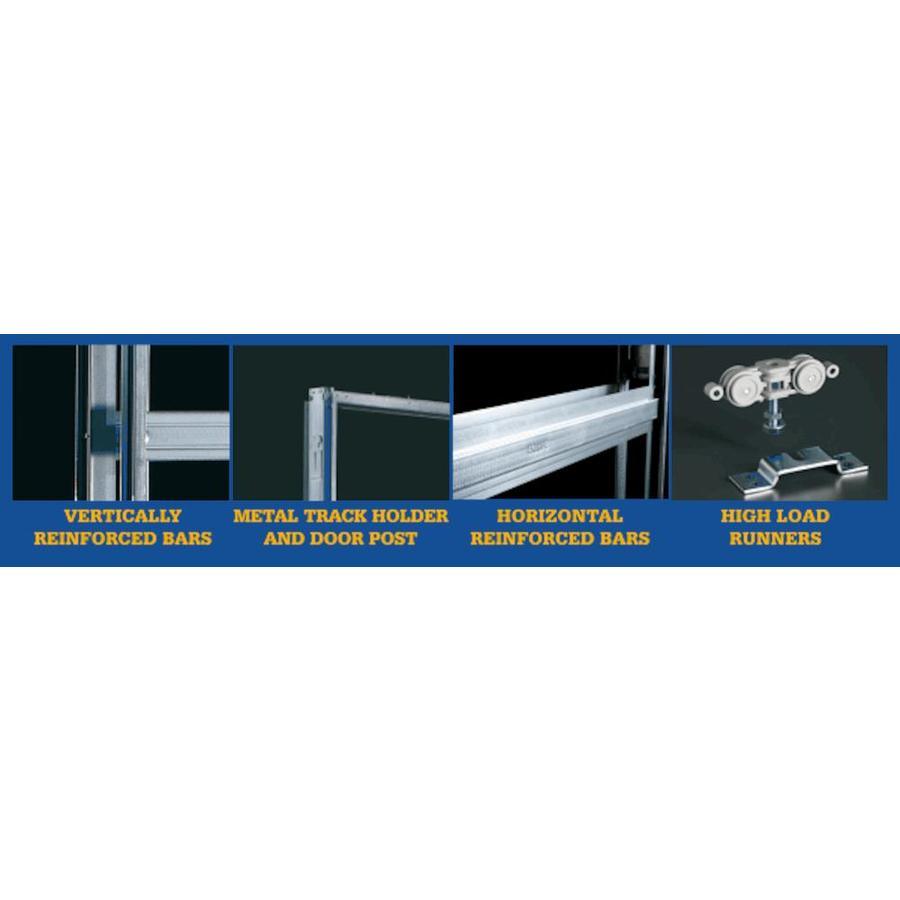 Frame kit includes: galvanized steel frame (assembly required), patented removable track, floor guide, maintenance free track and runners, two adjustable door stops, door mounting kit, all required assembly screws and drywall screws
