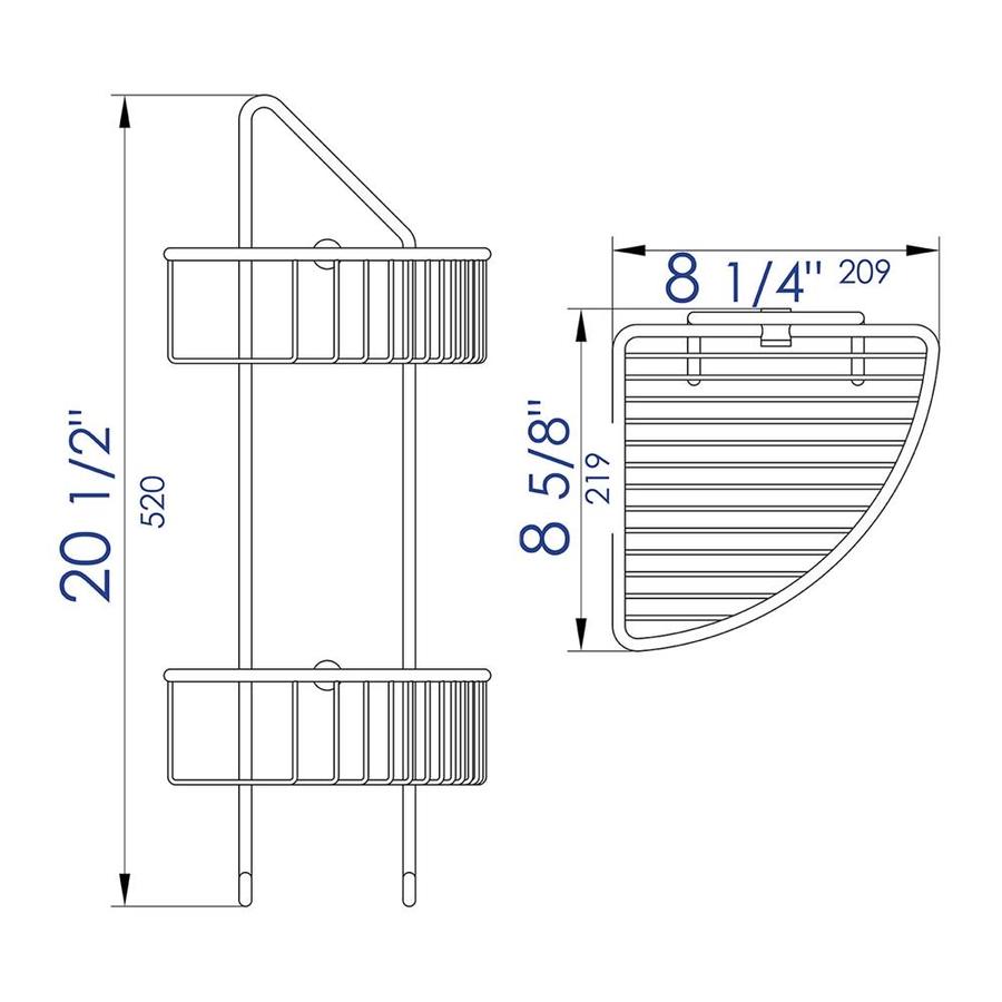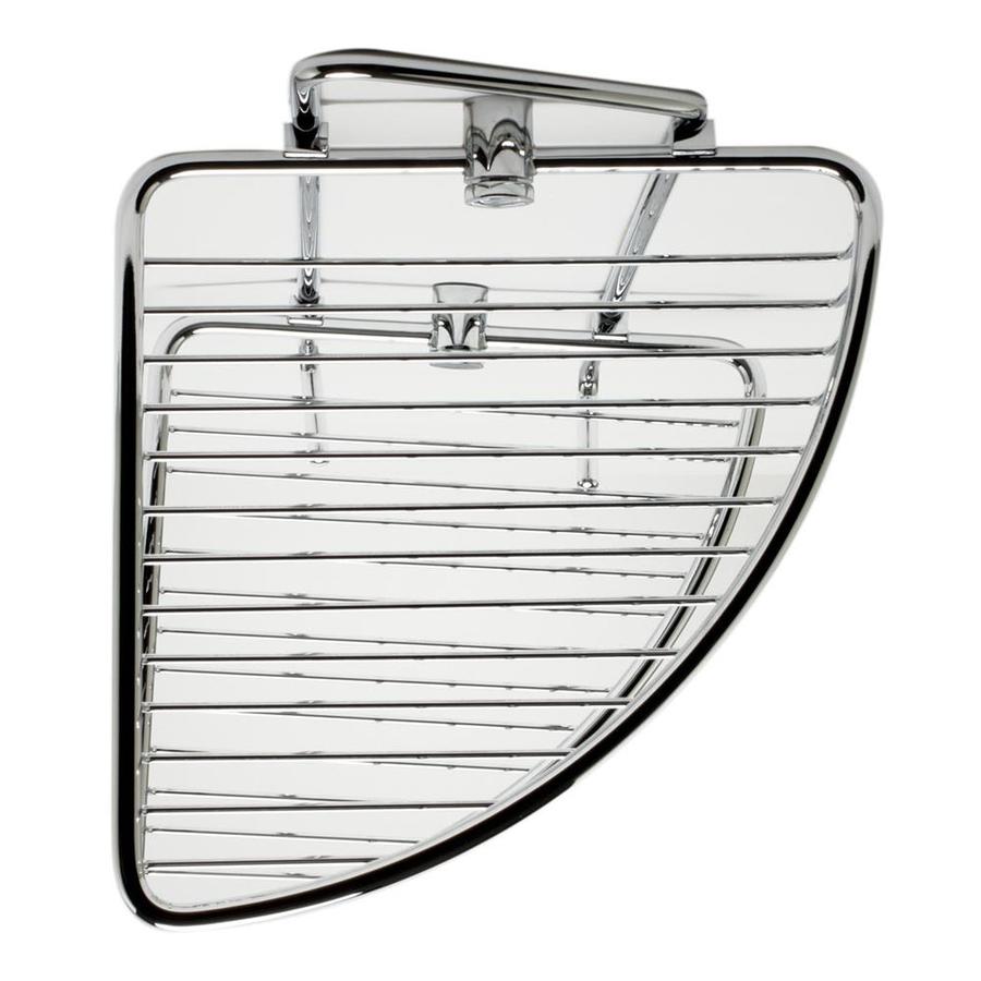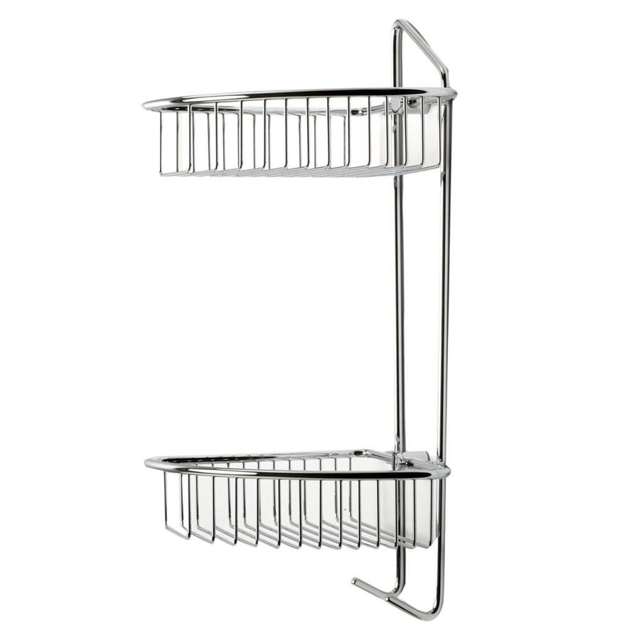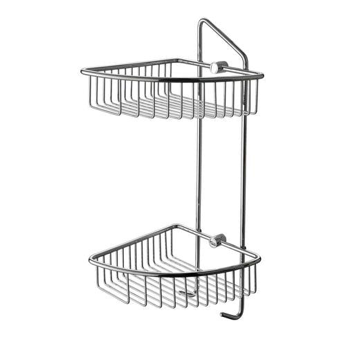 Includes two baskets on one corner mounted unit Coated with a Polished Chrome finish Expertly crafted solid brass construction for long-lasting durability Sleek design matches most dcor styles Concealed wallmount installation keeps your bathroom esthetics on point Corner shelves make the best use of space in tight shower spaces Wire basket shower caddies hold up long than traditional shelves as they allow water to drain so it doesn't pool on or spot the surface