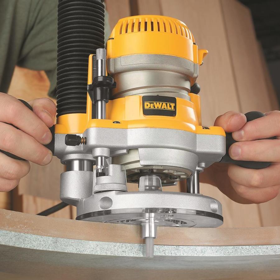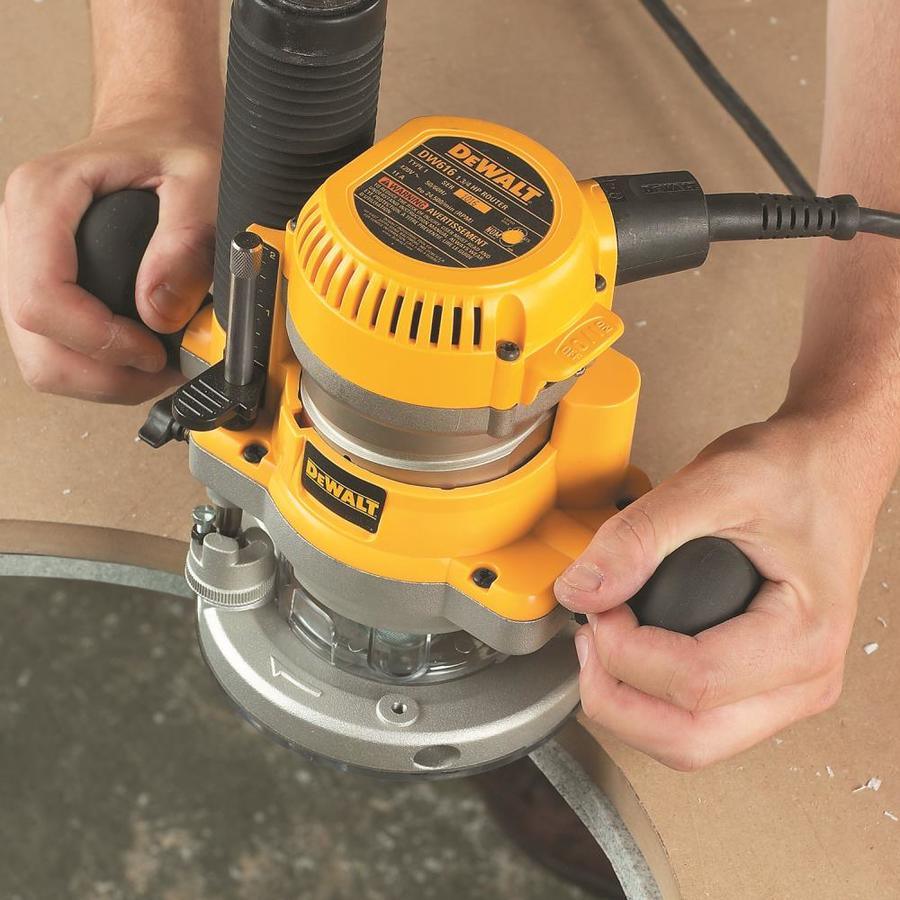 Micro-fine depth adjustment on plunge base 5/128-in per turn for precise routing in veneer and inlays