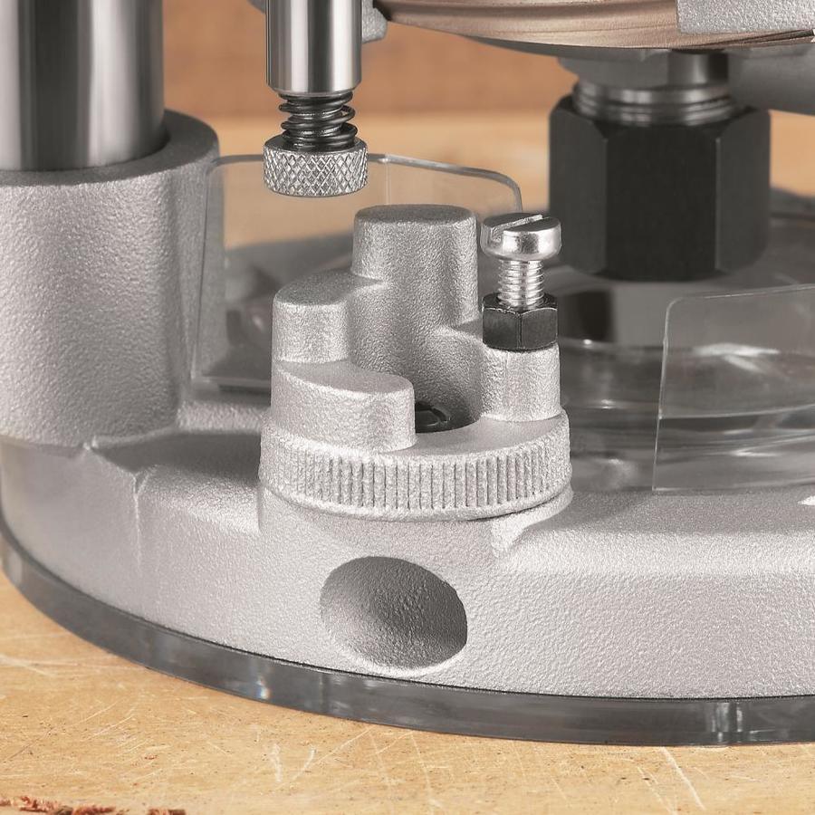 Adjustable, tool-free steel motor cam lock makes depth adjustment and base changes quick and solid-locking
