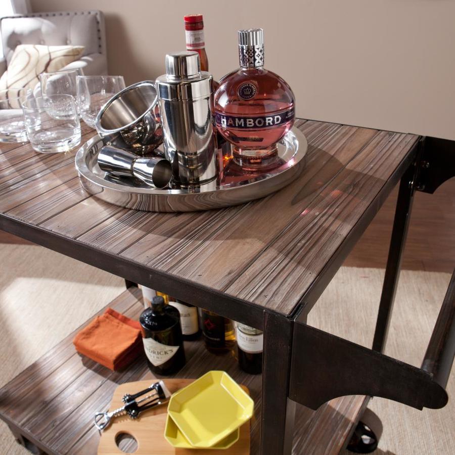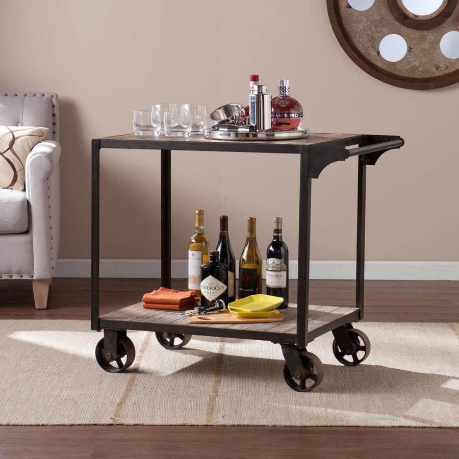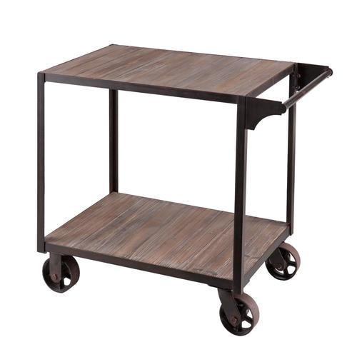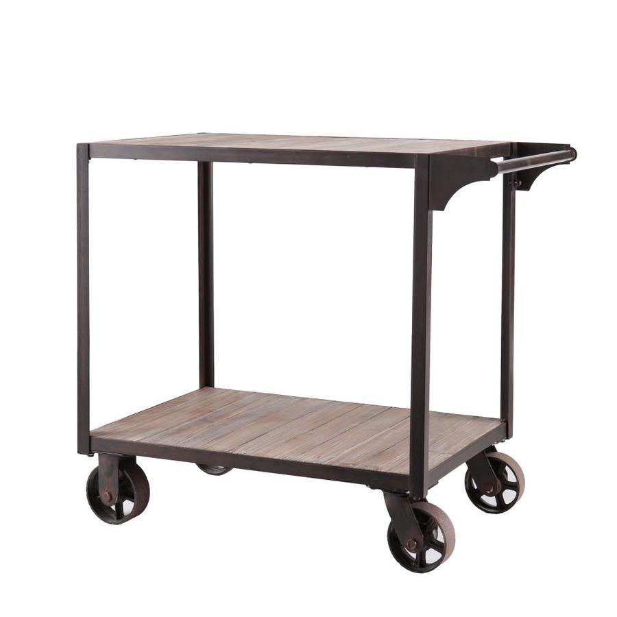Large handle guides oversized aged black, iron wheels where you need them Mixed materials combine for hip look Features open shelf and sweeping tabletop Top shelf: 28.5-in L x 19.75-in W Bottom shelf: 28.75-in L x 20-in W x 21.75-in H Clearance: 18-in L x 11-in W x 6-in H Supports up to: 30-lbs (per shelf)