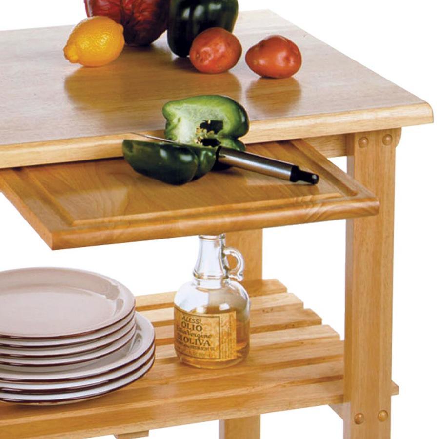 A convenient accessory in the kitchen, on the patio, or anywhere else Features built-in knife block and cutting board 2 Lower storage shelves Kitchen cart features open storage shelves and towel bar Casters for easy mobility