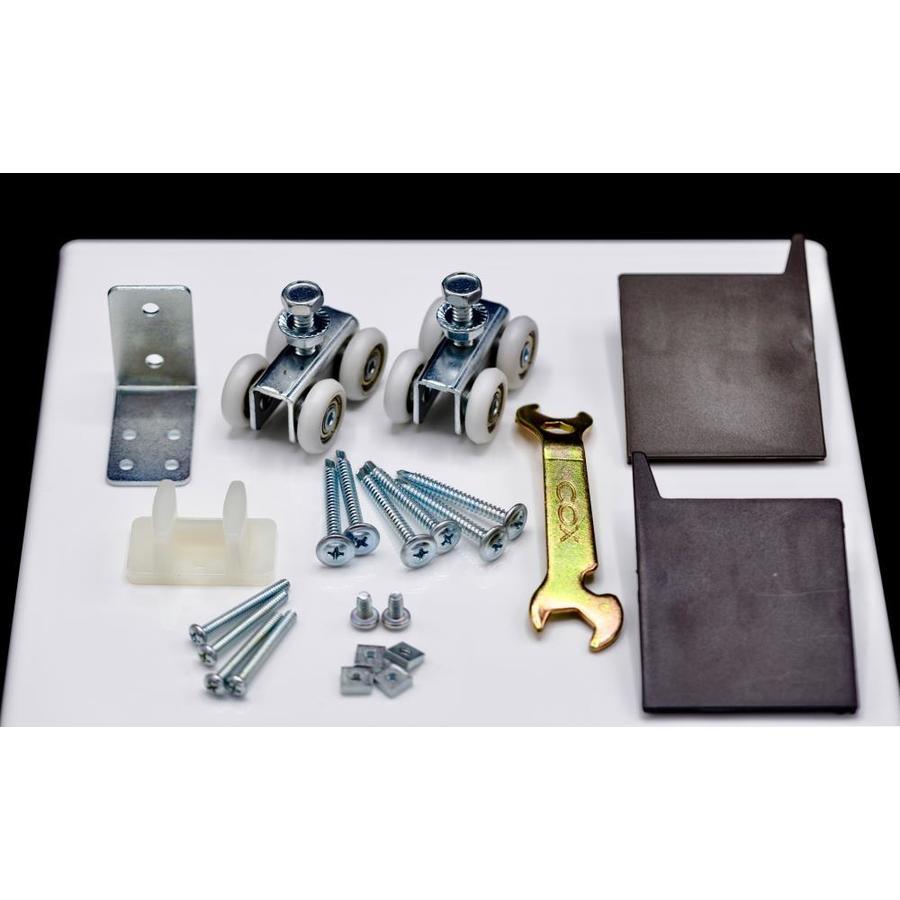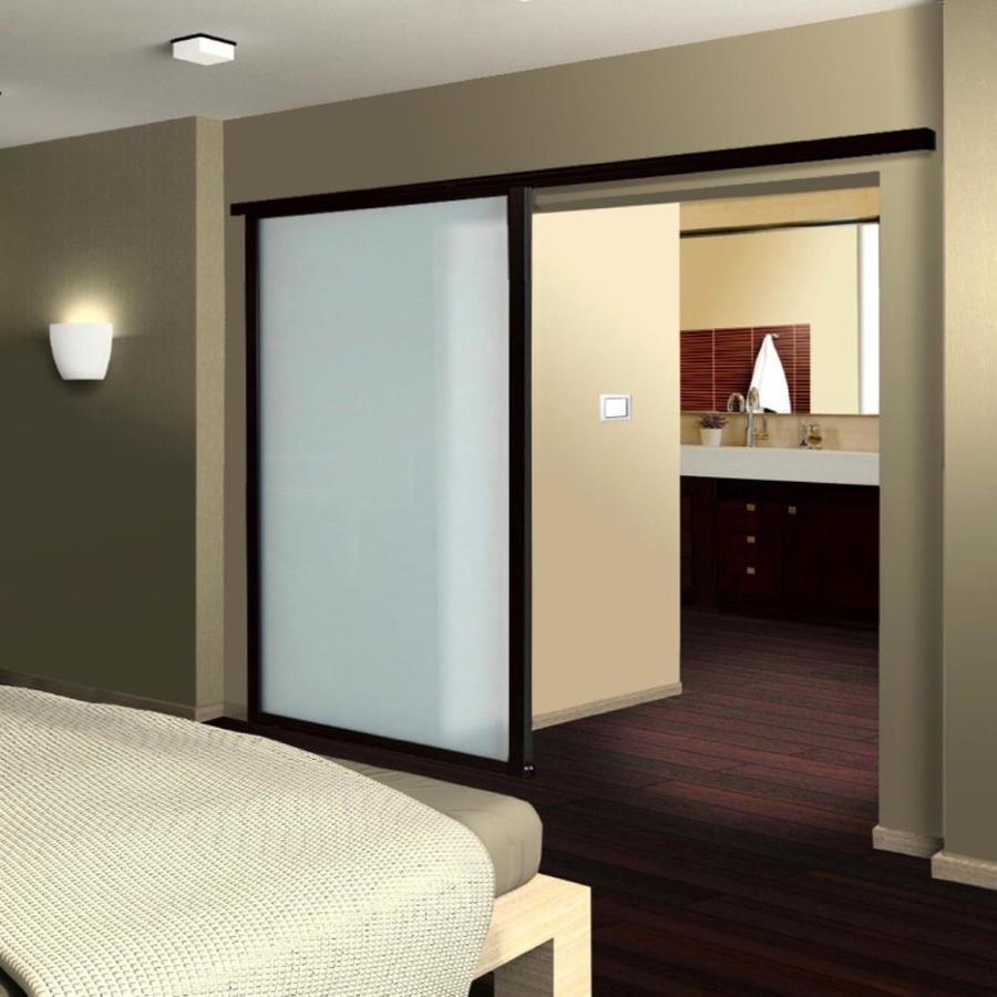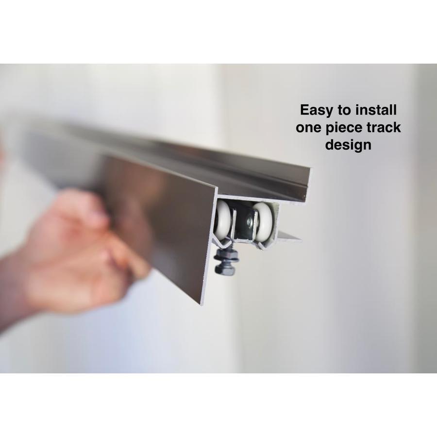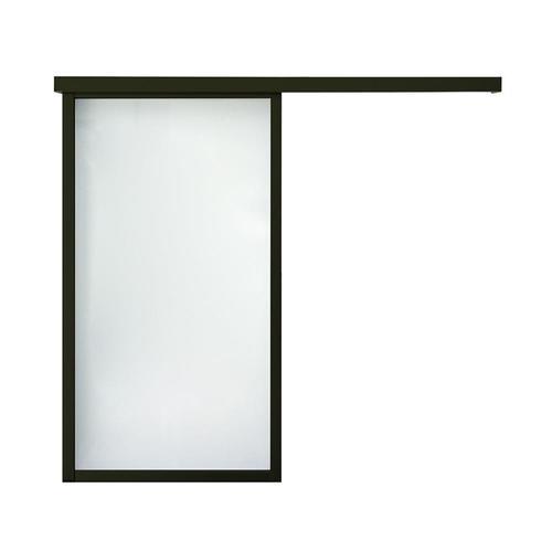 Wall sliding barn door with commercial grade Java finished aluminum frame with opaque white glass insert, ideal for finished openings that are 42-in wide x 80-in high A minimum header space of 3-in above the finished opening is required to install the top track (Track hardware: 88.125-in wide x 3.3-in x 2.147-in deep) Fingerprint resistant laminated safety glass Surface mounted design is easy to install Wall sliding doors conserve space where a hinged doors swing would be impractical Glass doors with an elegant urban design that allow natural light to pass thru Use for closet, room divider or passage door applications Ball bearing top rollers are adjustable for easy door alignment and provide smooth and quite operation Package included all hardware and fasteners