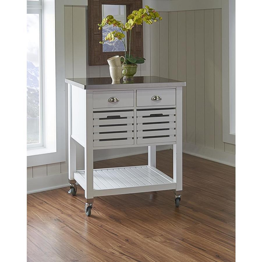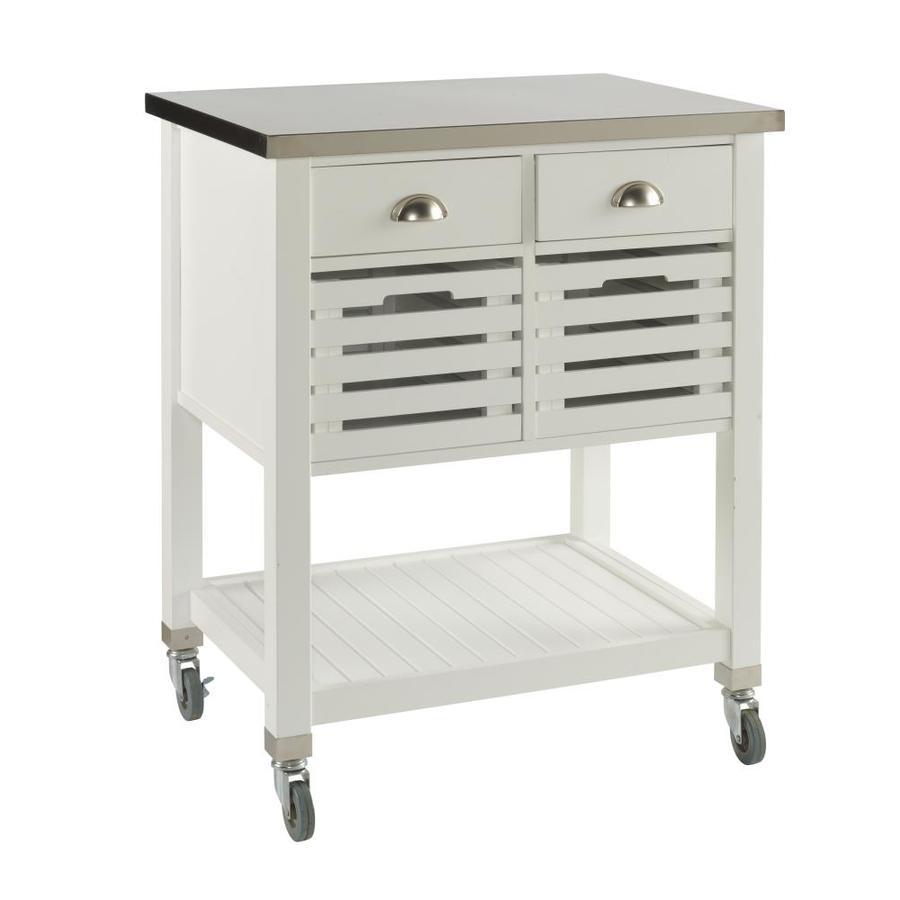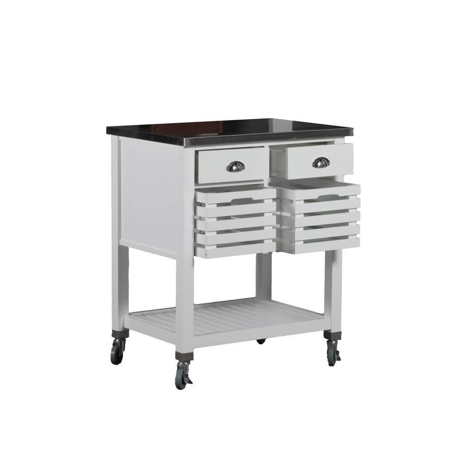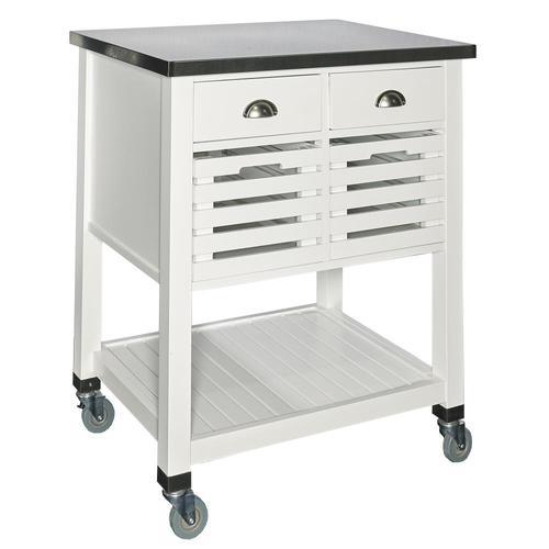Stainless steel top Two drawers, two pull out baskets and a bottom shelf provide ample storage space Castor provide for easy mobility Transitional design and style Basket inner dimensions: 11-in x 16-in x 9-in