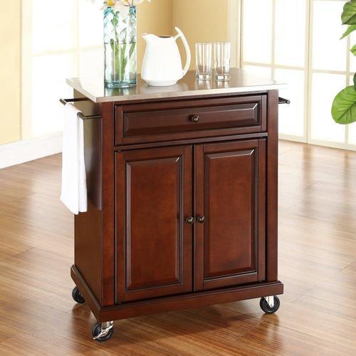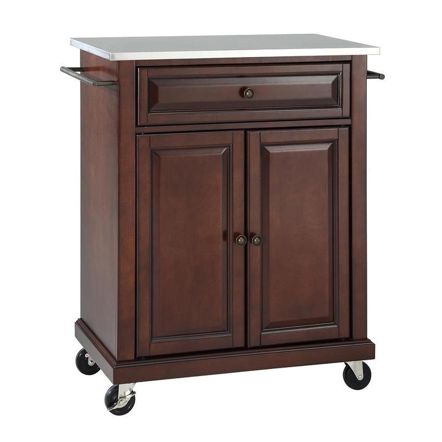 The beautiful raised panel doors and drawer front provide the ultimate in style to dress up your kitchen The deep drawer is great for anything from utensils to storage containers Behind the 2 doors, you will find an adjustable shelf and an abundance of storage space Heavy duty locking casters Decorative vintage mahogany finish Stainless steel top 90-day limited warranty