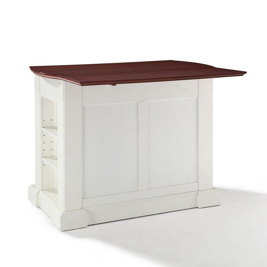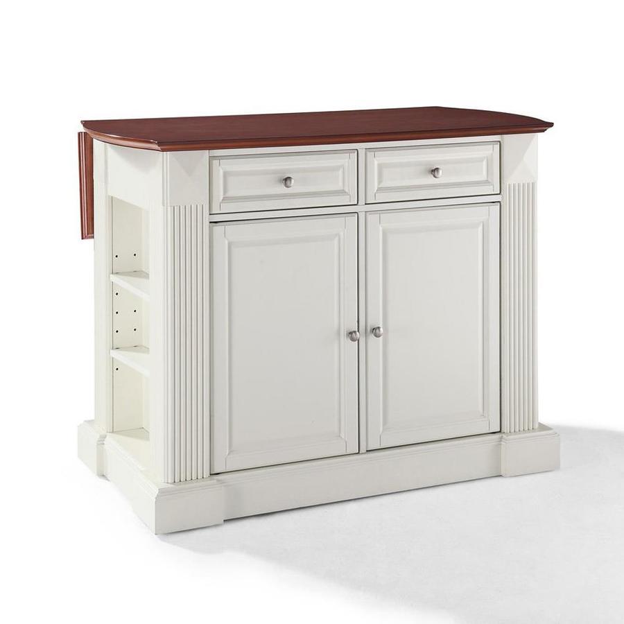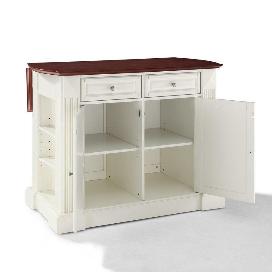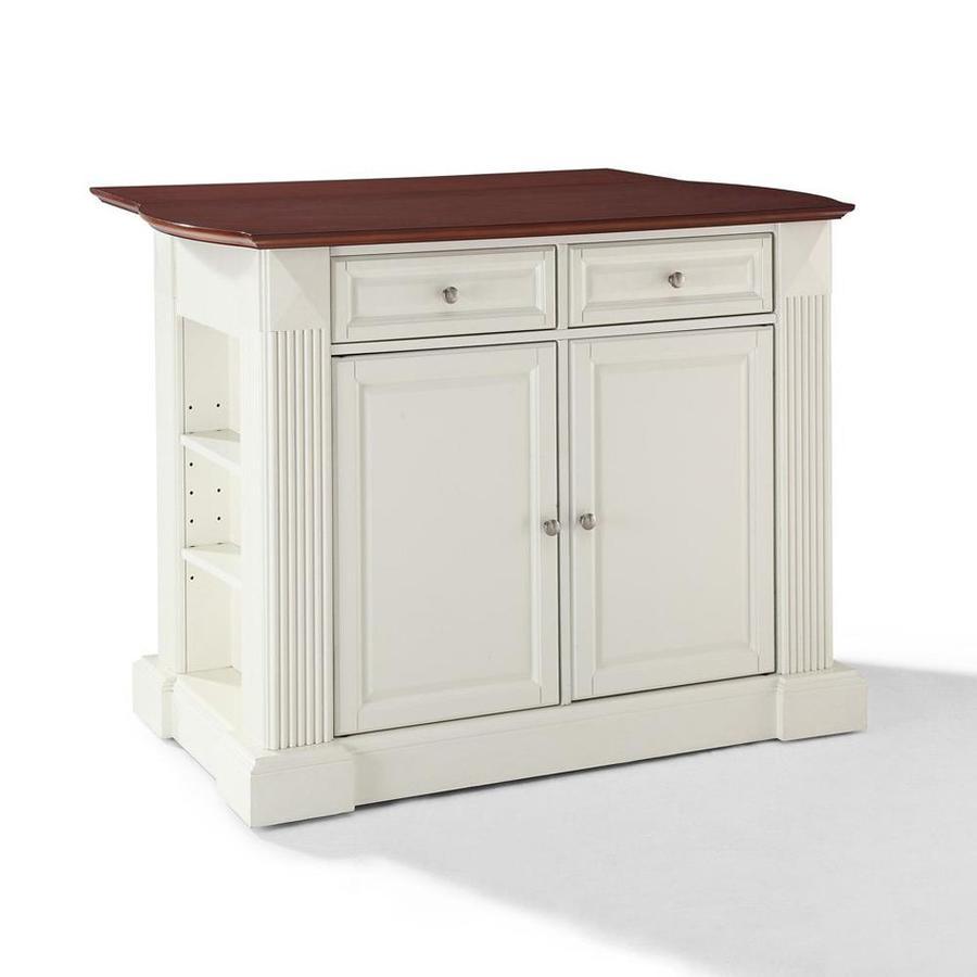 Style, function, and quality make this kitchen island a wise addition to your home Drop leaf for additional space Beautiful sculpted edges on each end of top Open storage with adjustable shelves on each end Raised panel doors, drawers and side panels Diamond accents and fluted pilasters 2 adjustable shelves behind doors 90-day limited warranty