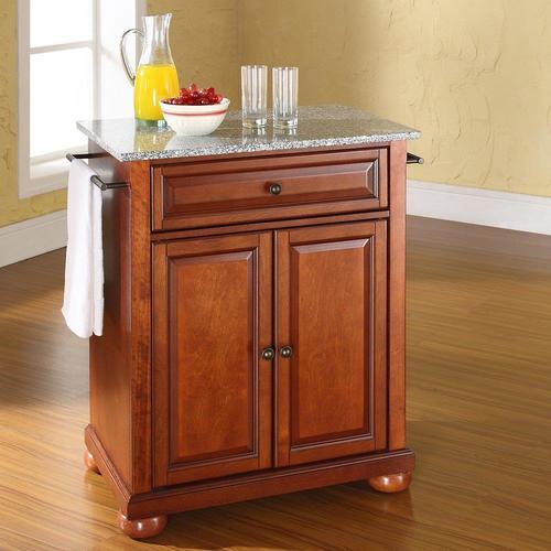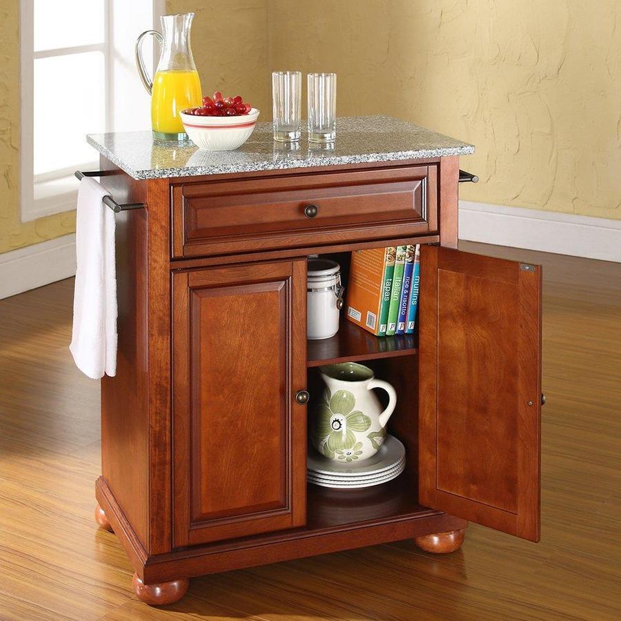 The beautiful raised panel doors and drawer fronts provide the ultimate in style to dress up any culinary space The deep drawer is great for anything from utensils to storage containers Behind the doors is an adjustable shelf and an abundance of storage space Solid granite countertop Features built-in towel bars Decorative classic cherry finish 90-day limited warranty