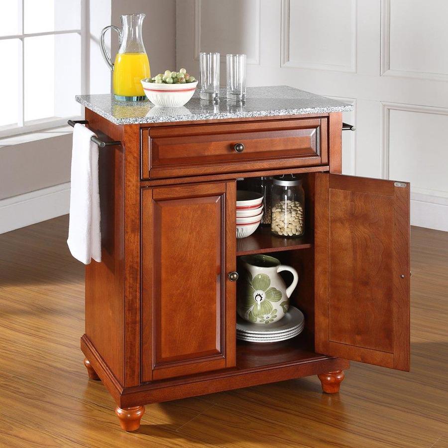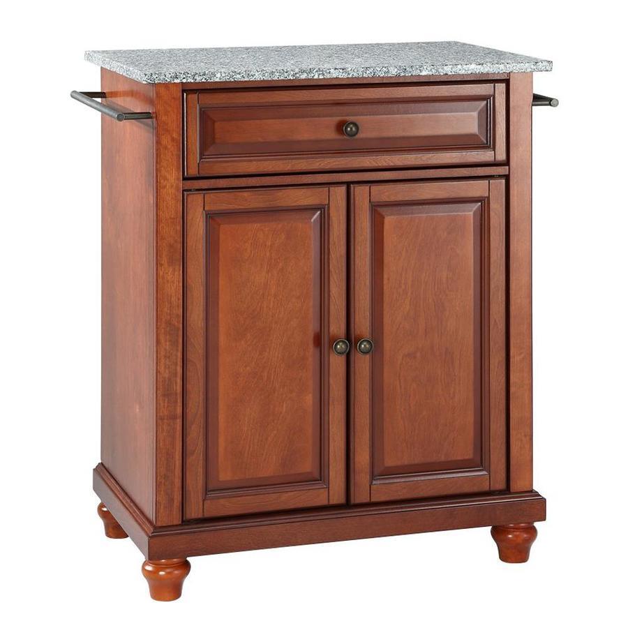 The beautiful raised panel doors and drawer fronts provide the ultimate in style to dress up any culinary space The deep drawer is great for anything from utensils to storage containers Behind the doors is an adjustable shelf and an abundance of storage space Solid granite countertop Features built-in towel bars Decorative classic cherry finish 90-day limited warranty
