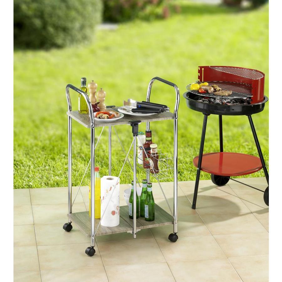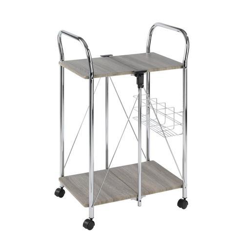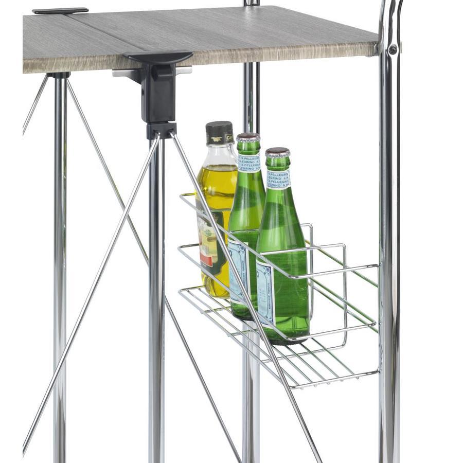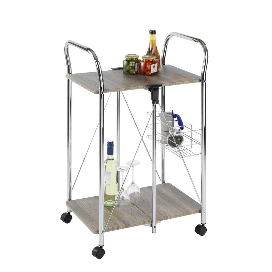 Ideal as a Side Table for the kitchen, living room bathroom or patio Robust metal frame with four smoothly-running castors Two storage shelves in wood decor Bottle basket offering additional storage space for up to 4 bottles Easily foldable to save space